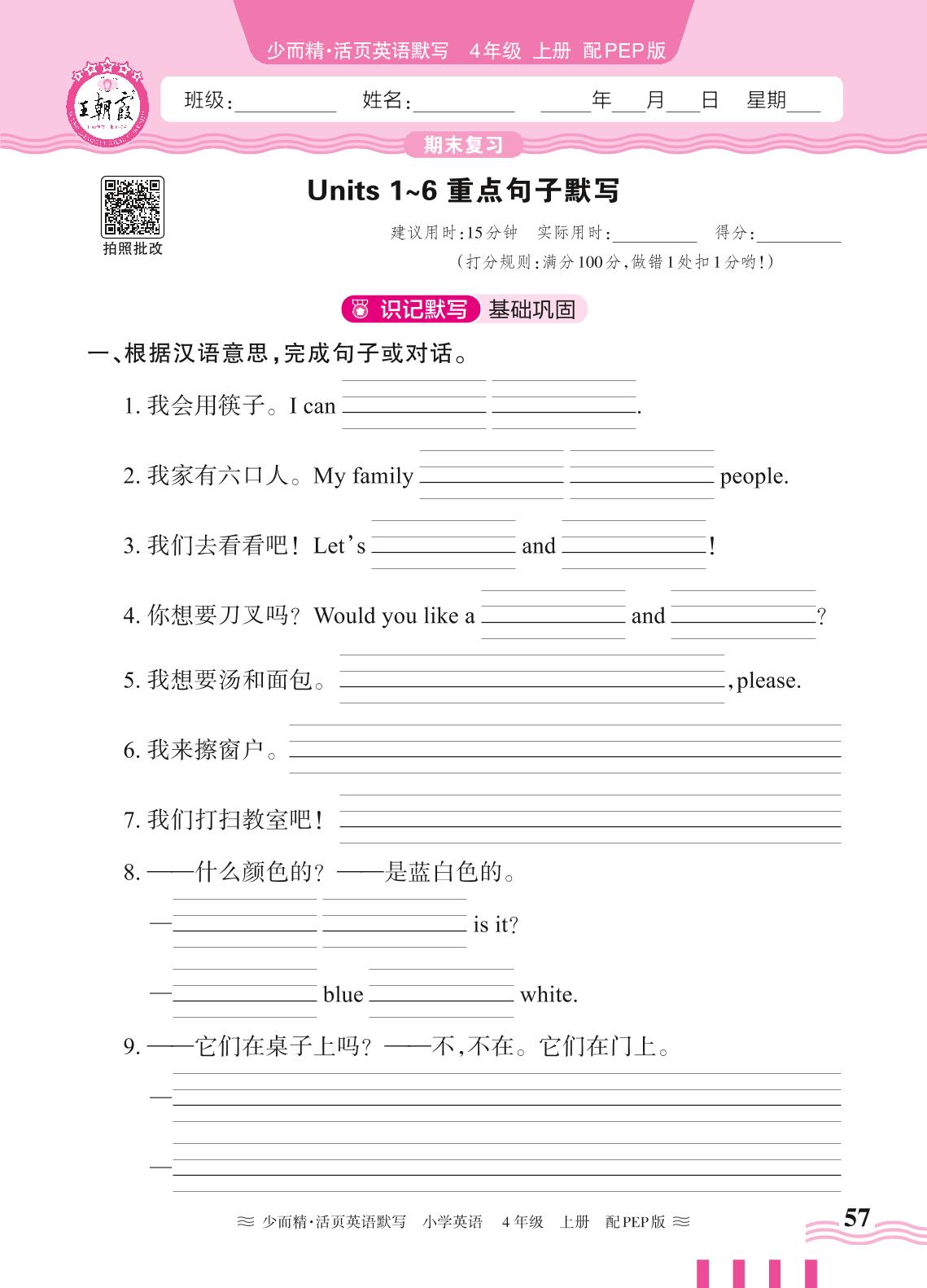 2024秋上册四年级英语人教PEP版(三起始) 期末复习—Units 1~6 重点句子默写