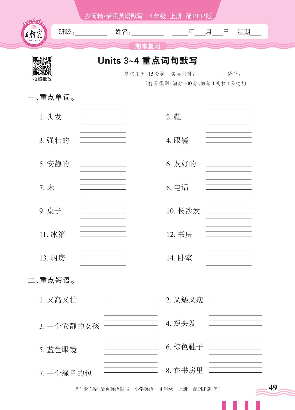 2024秋上册四年级英语人教PEP版(三起始) 期末复习—Units 3~4 重点词句默写