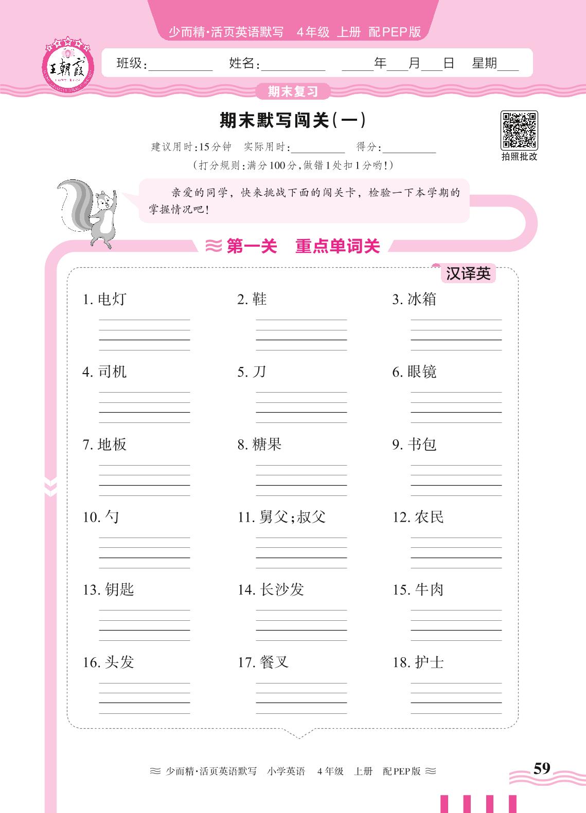 2024秋上册四年级英语人教PEP版(三起始) 期末默写闯关(一)