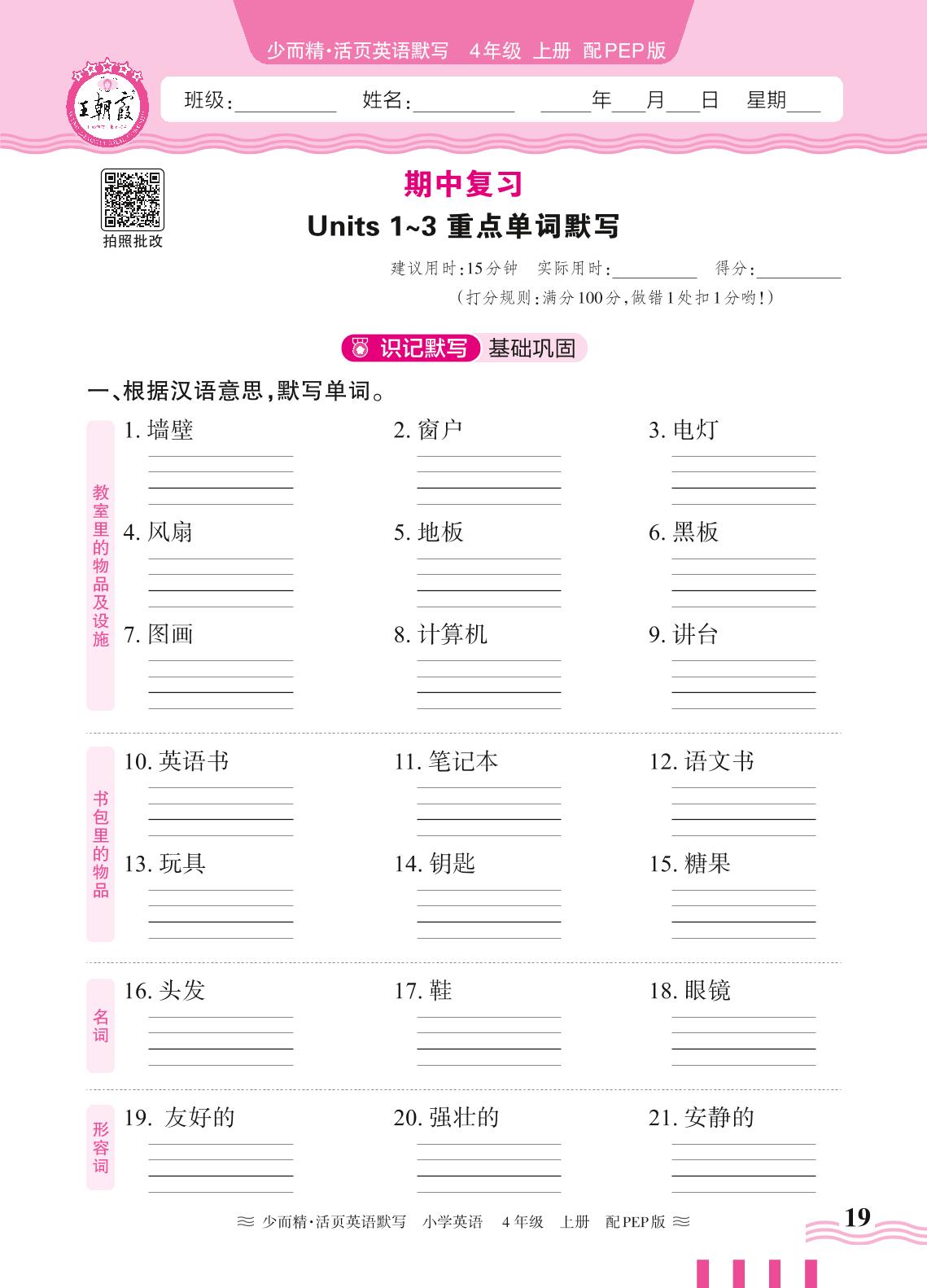 2024秋上册四年级英语人教PEP版(三起始) 期中复习—Units 1~3 重点单词默写