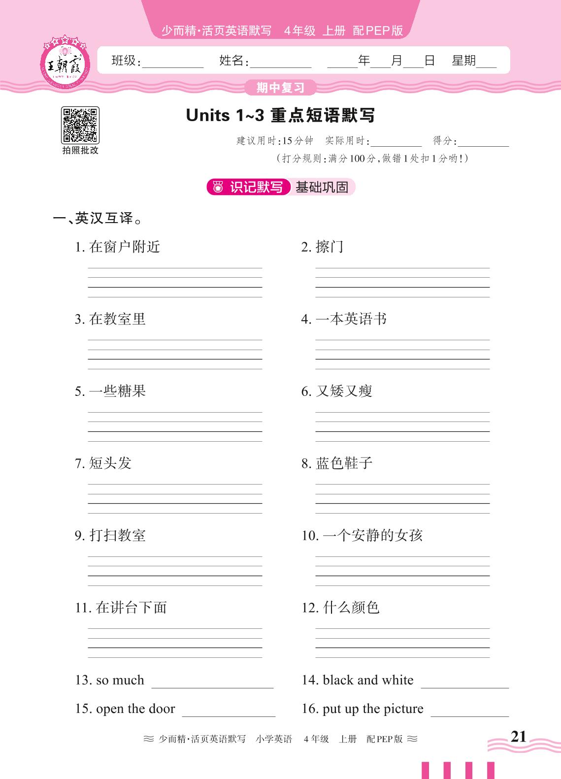 2024秋上册四年级英语人教PEP版(三起始) 期中复习—Units 1~3 重点短语默写