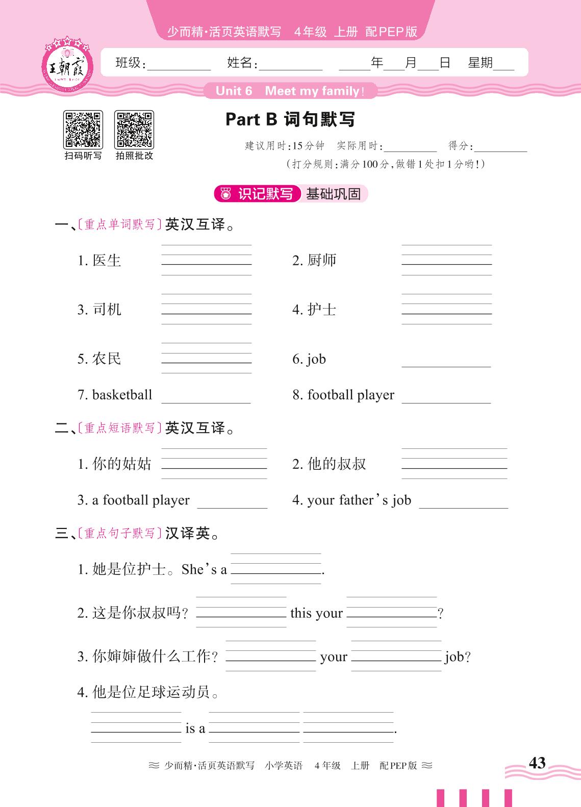 2024秋上册四年级英语人教PEP版(三起始) Unit 6—Part B 词句默写