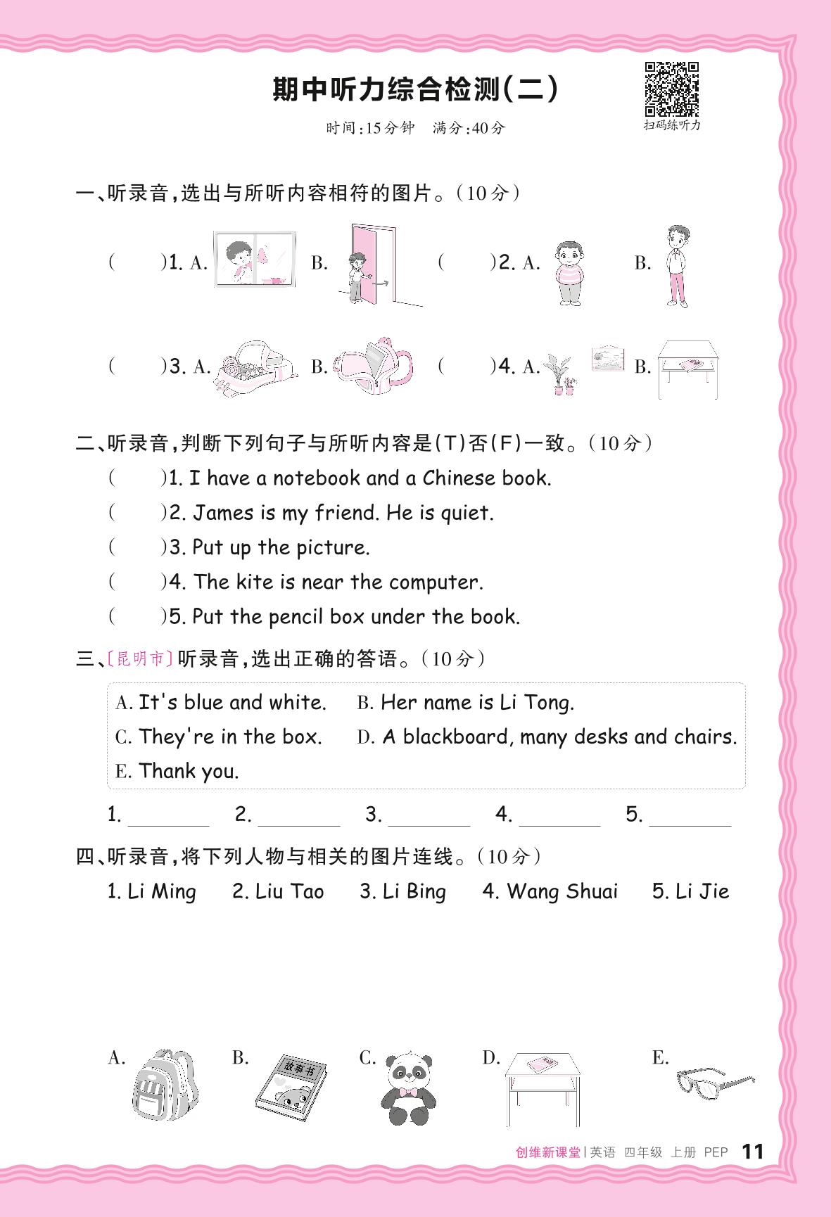 2024秋上册四年级英语人教PEP版(三起始) 期中听力综合检测(二)