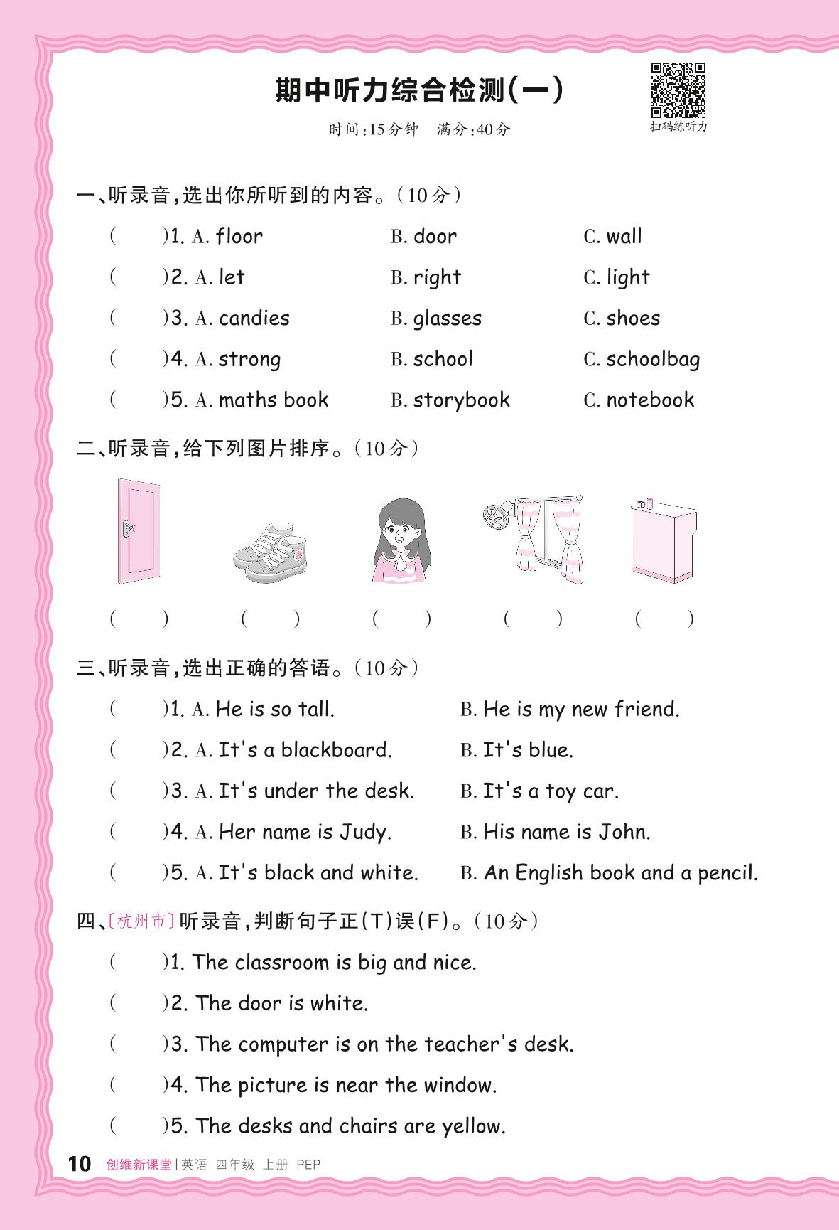 2024秋上册四年级英语人教PEP版(三起始) 期中听力综合检测(一)
