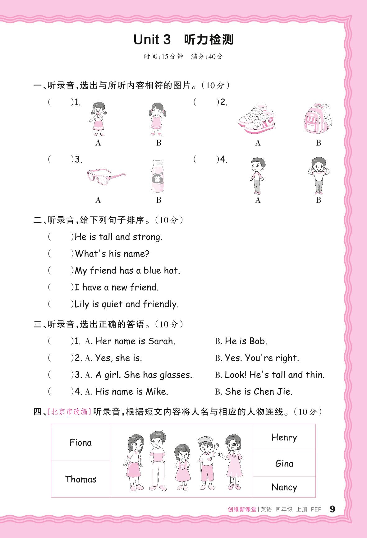2024秋上册四年级英语人教PEP版(三起始) Unit 3 听力检测