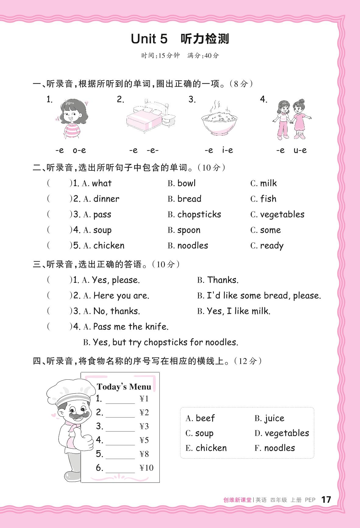 2024秋上册四年级英语人教PEP版(三起始) Unit 5 听力检测