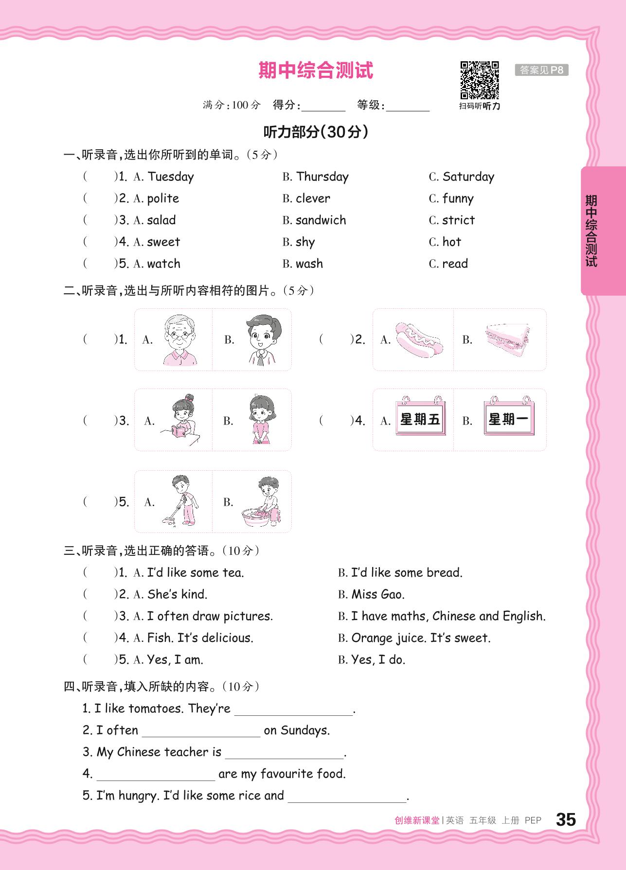 2024秋上册五年级英语人教PEP版(三起始) 期中综合测试