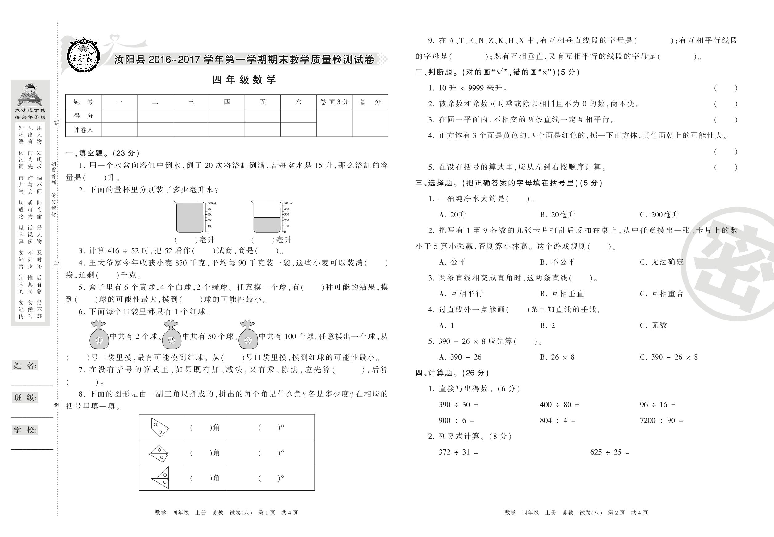 2016-2017学年第一学期洛阳市汝阳县四年级数学试卷(苏教版)【8】