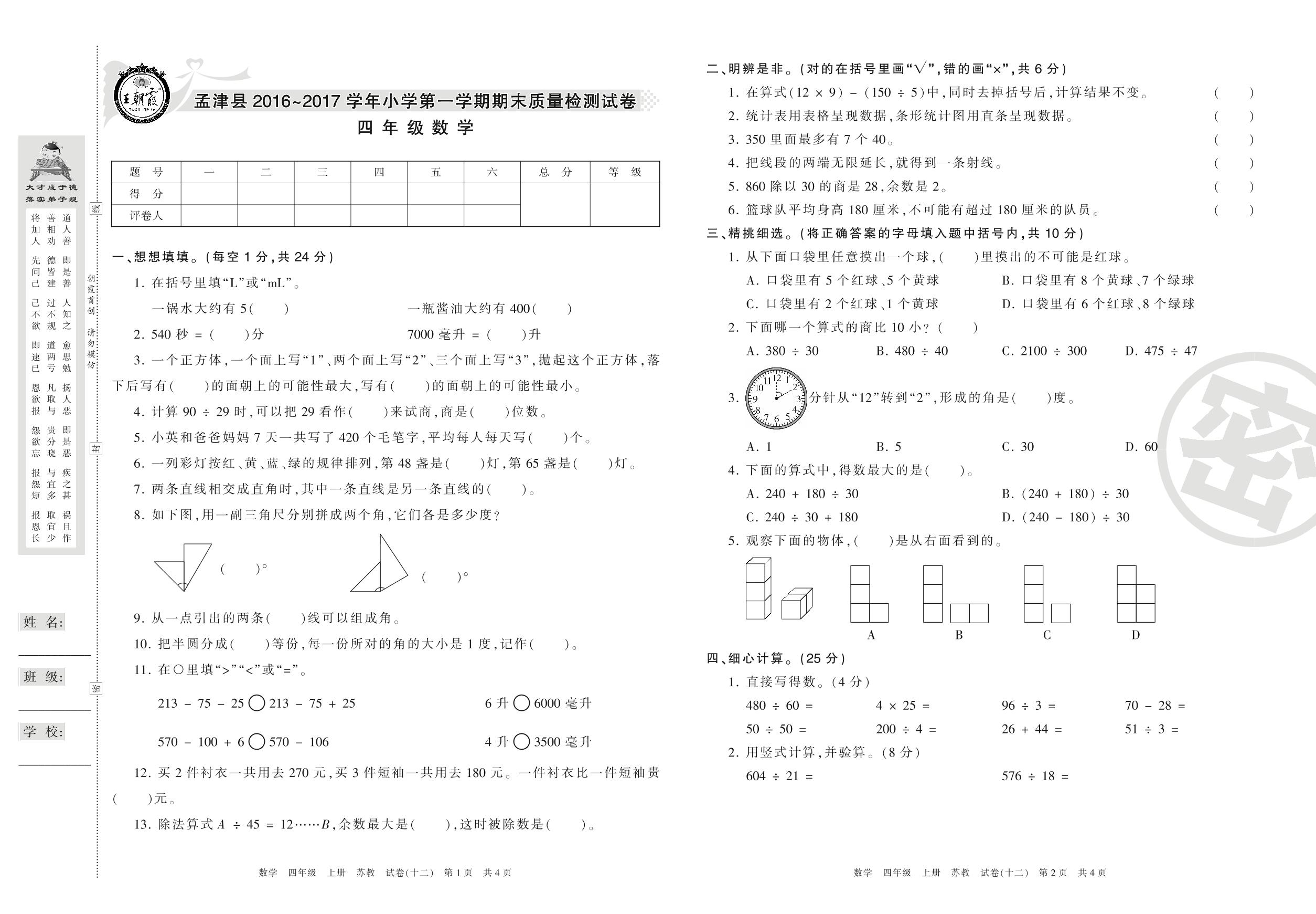 2016-2017学年第一学期洛阳市孟津县四年级数学试卷(苏教版)【12】