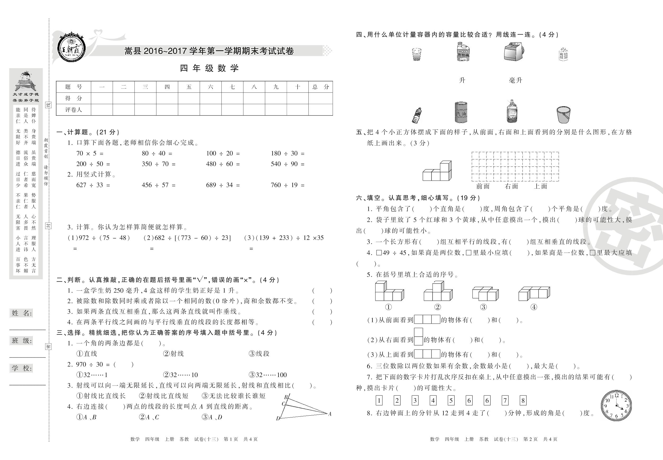2016-2017学年第一学期洛阳市嵩县四年级数学试卷(苏教版)【13】