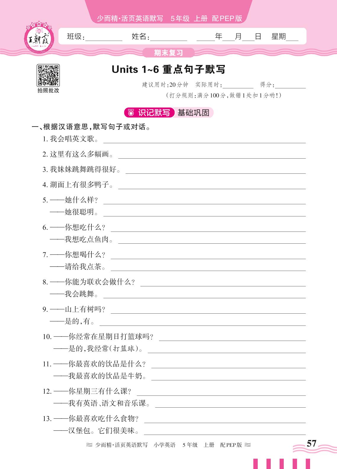 2024秋上册五年级英语人教PEP版(三起始) 期末复习—Units 1~6 重点句子默写