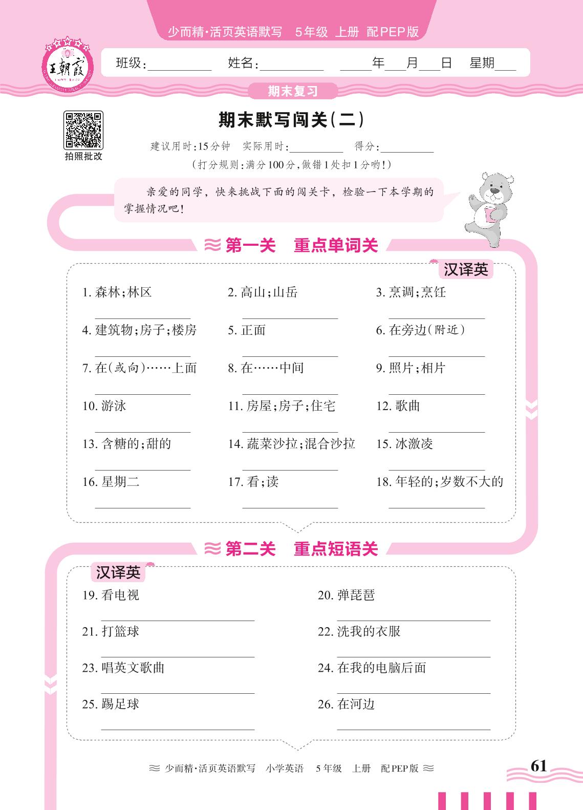 2024秋上册五年级英语人教PEP版(三起始) 期末默写闯关(二)