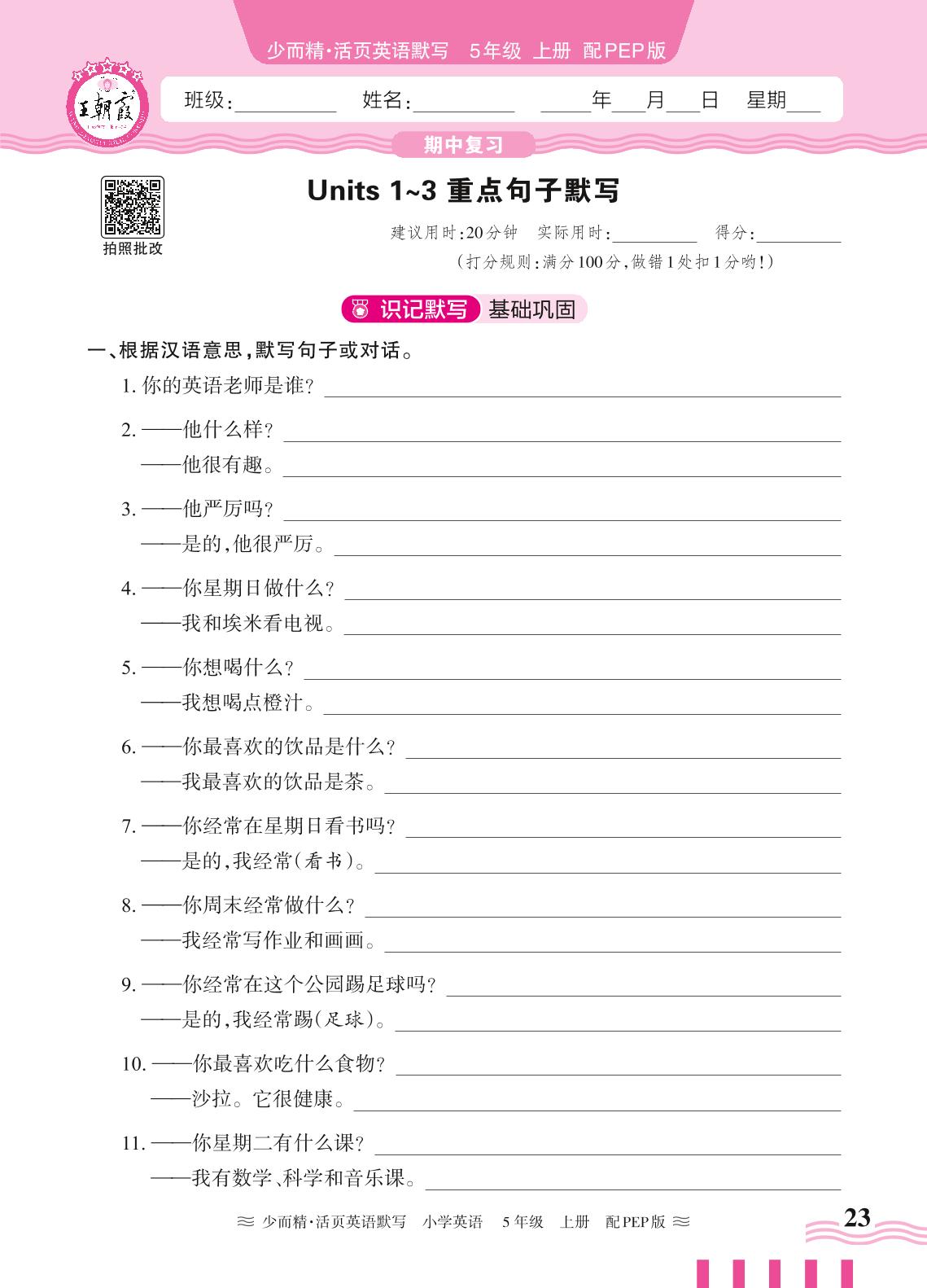 2024秋上册五年级英语人教PEP版(三起始) 期中复习—Units 1~3 重点句子默写