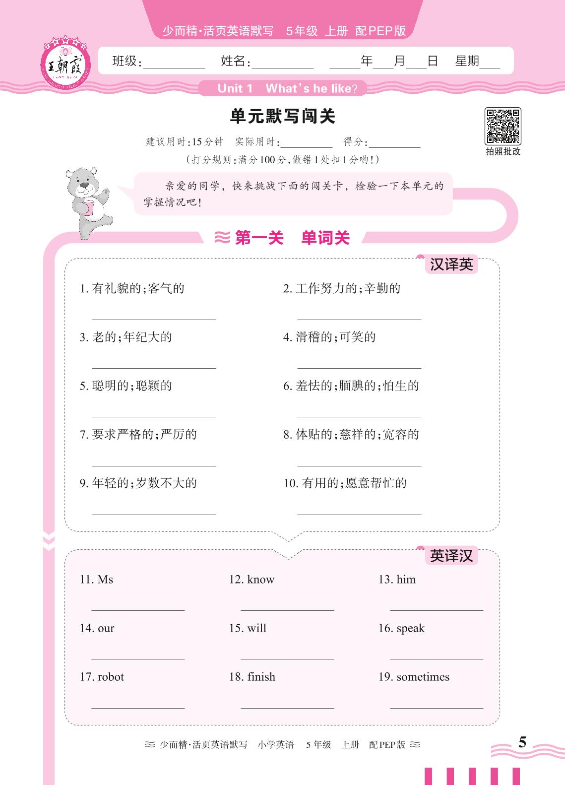 2024秋上册五年级英语人教PEP版(三起始) Unit 1 单元默写闯关