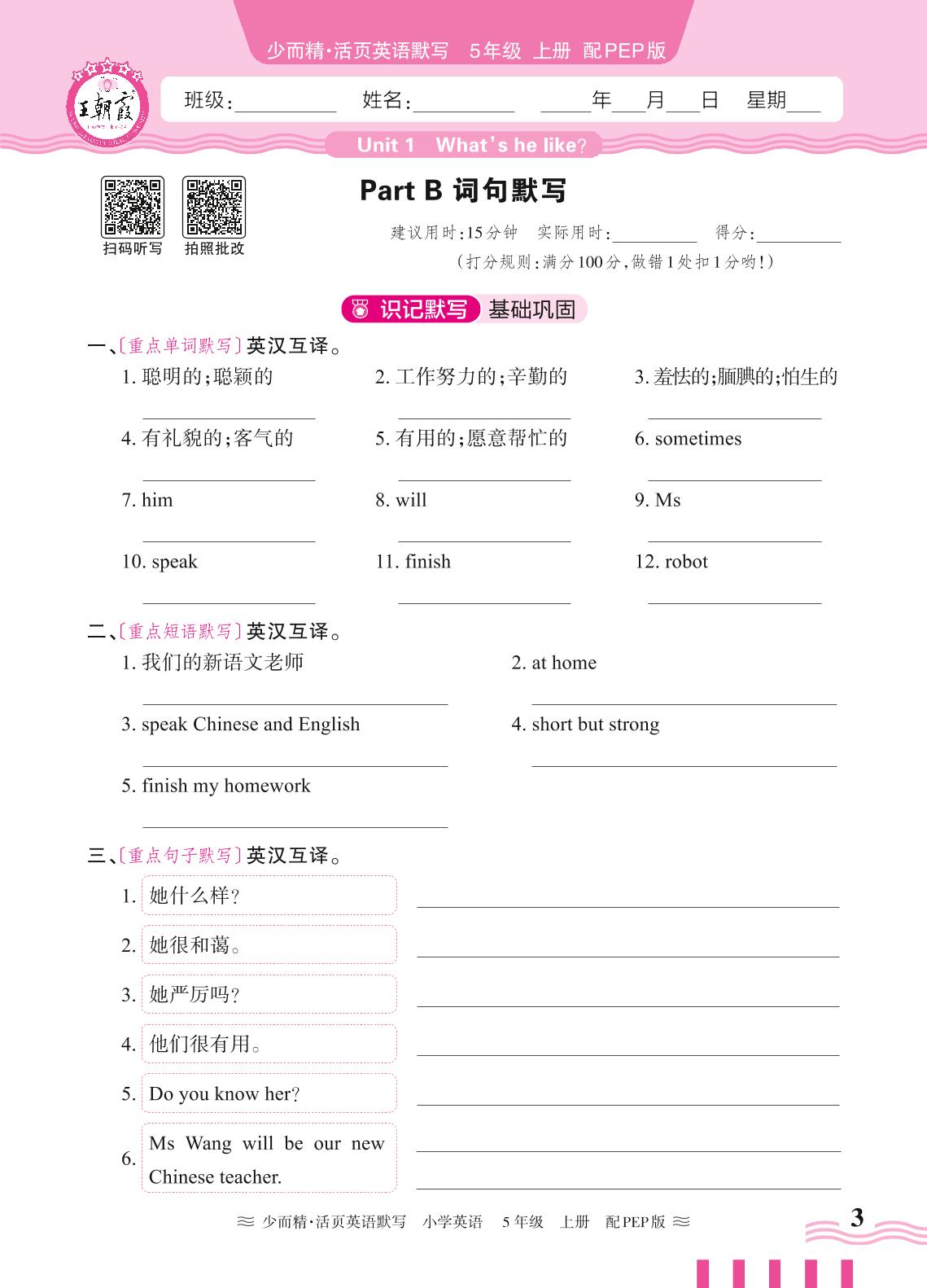 2024秋上册五年级英语人教PEP版(三起始) Unit 1—Part B 词句默写