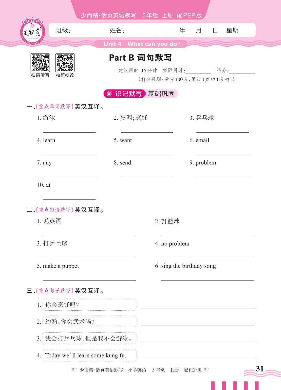 2024秋上册五年级英语人教PEP版(三起始) Unit 4—Part B 词句默写