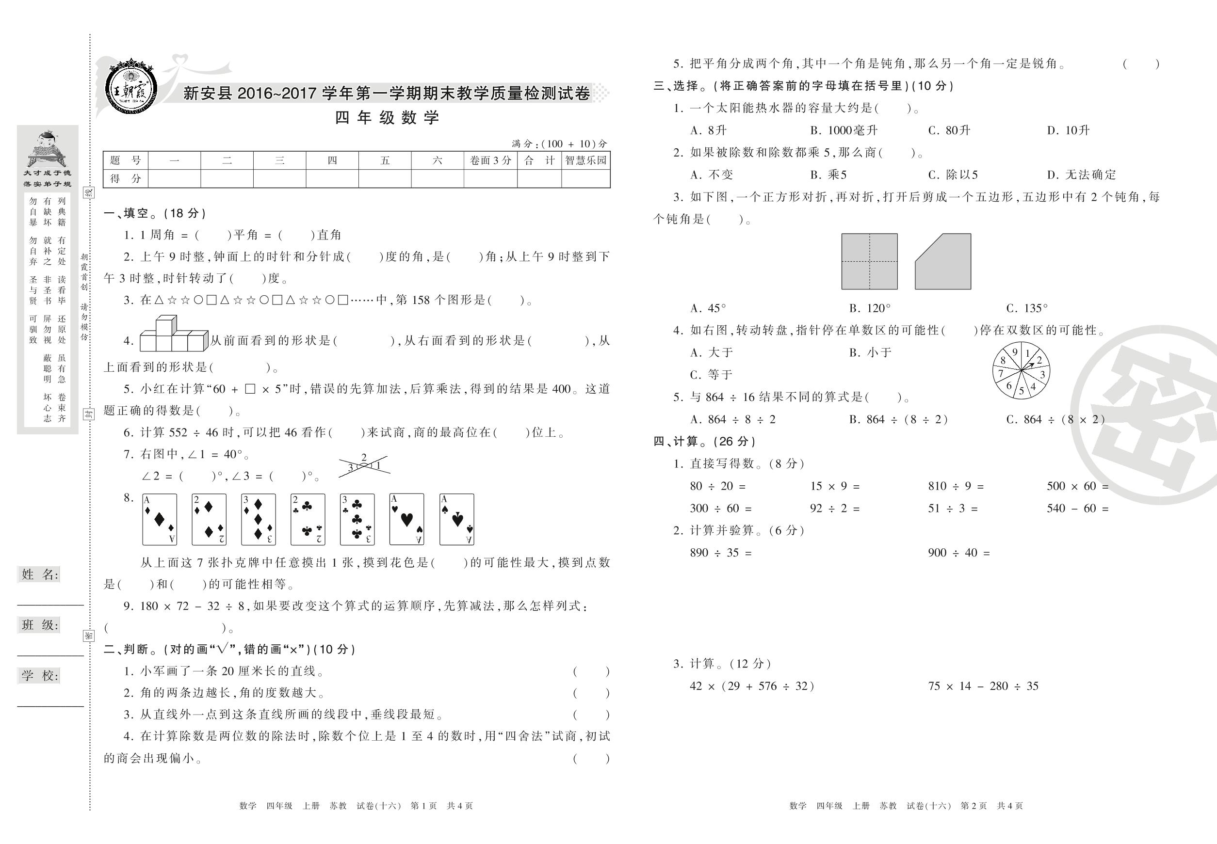 2016-2017学年第一学期洛阳市新安县四年级数学试卷(苏教版)【16】