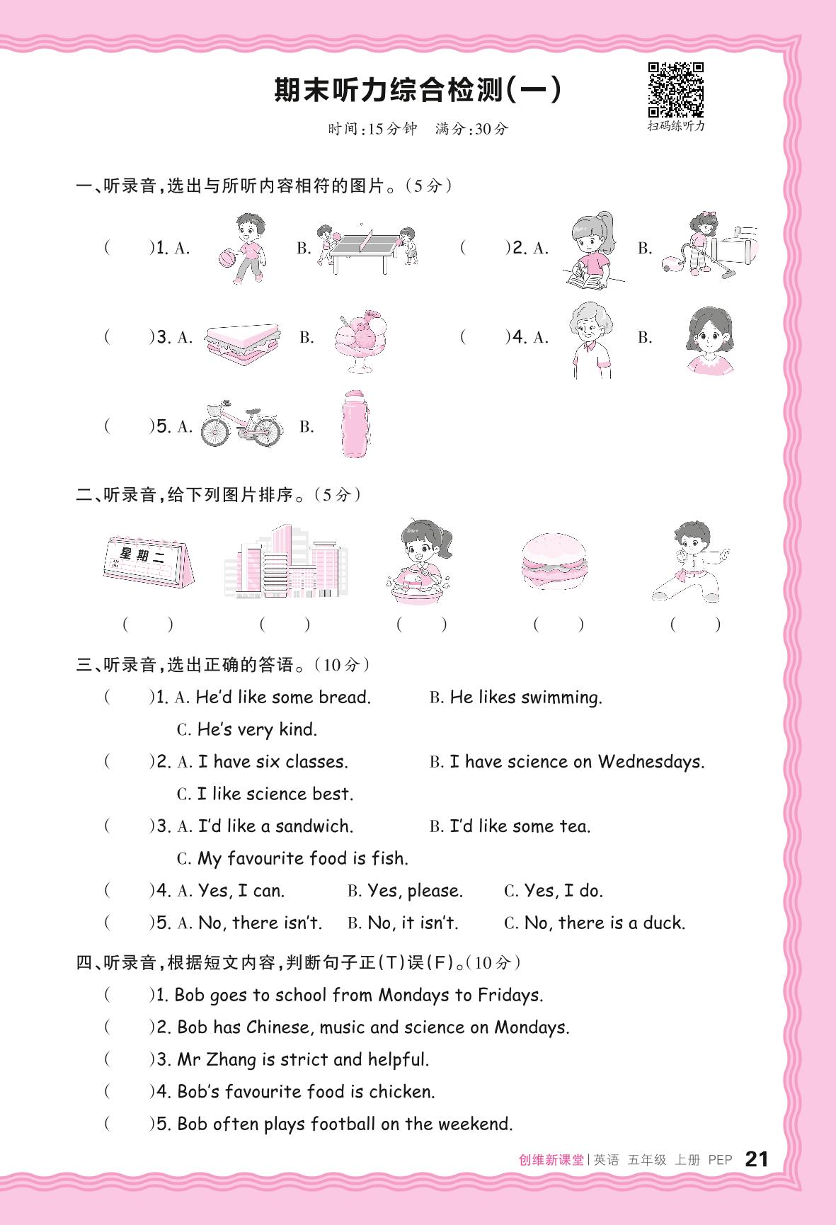 2024秋上册五年级英语人教PEP版(三起始) 期末听力综合检测(一)