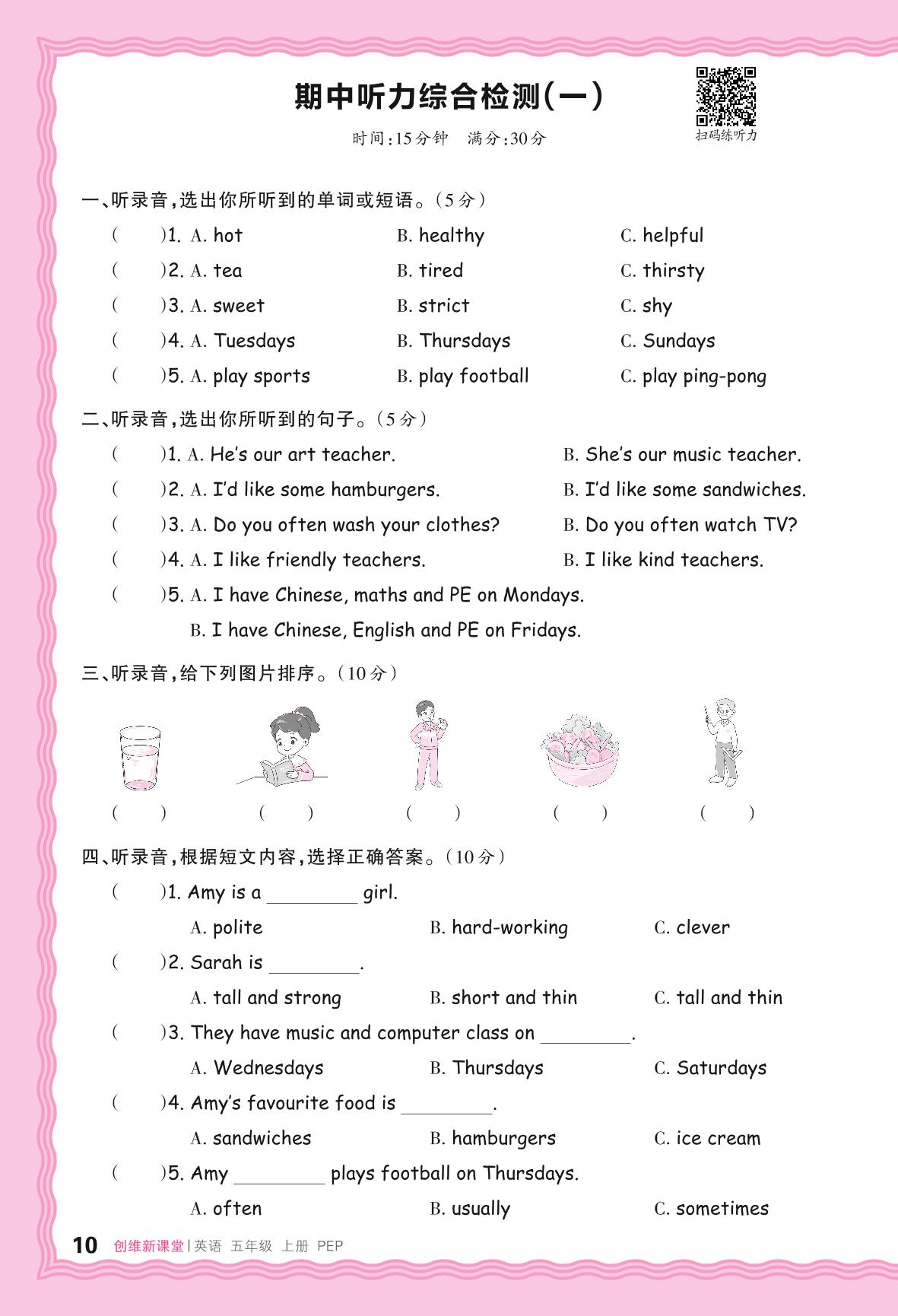 2024秋上册五年级英语人教PEP版(三起始) 期中听力综合检测(一)