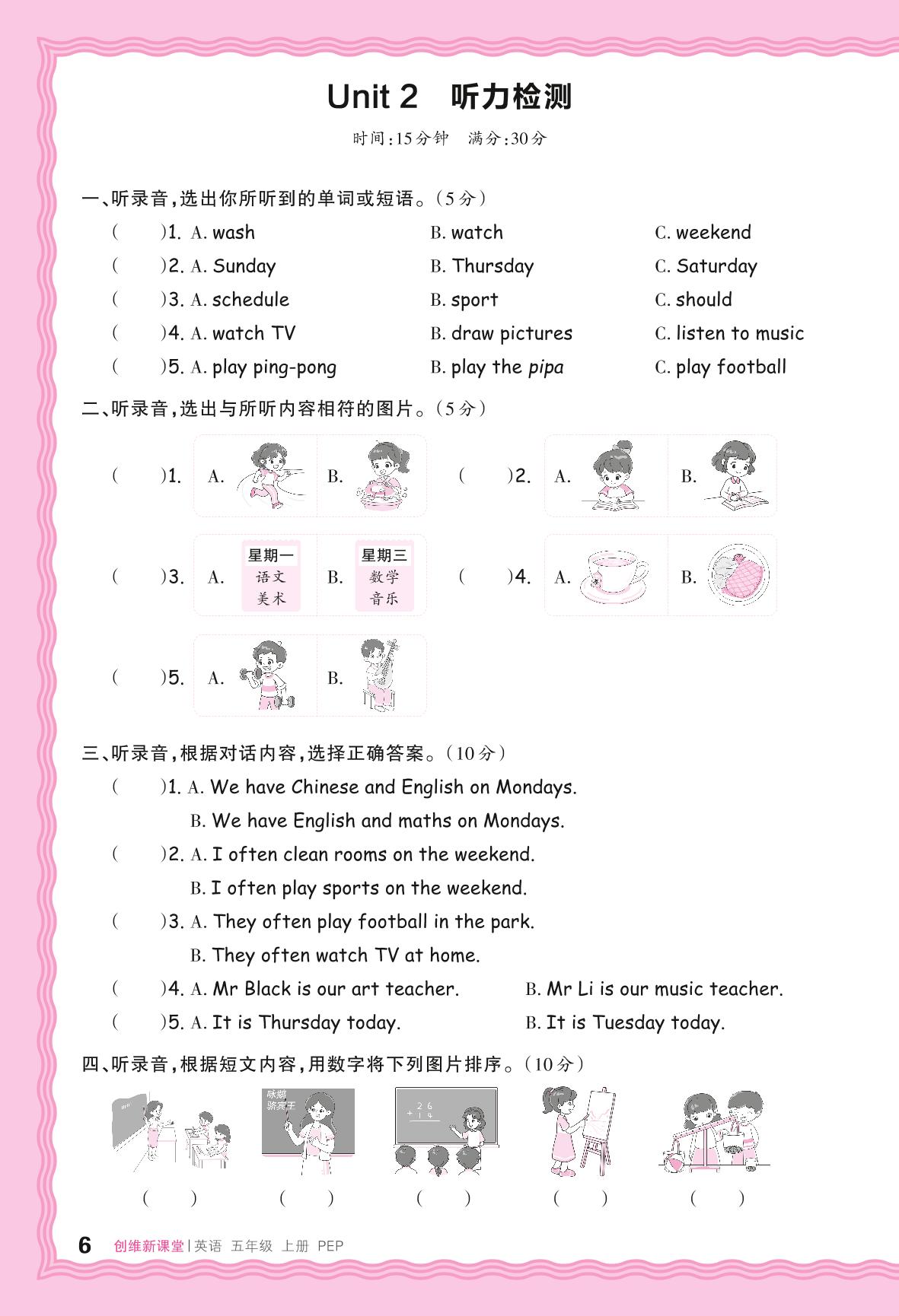 2024秋上册五年级英语人教PEP版(三起始) Unit 2 听力检测