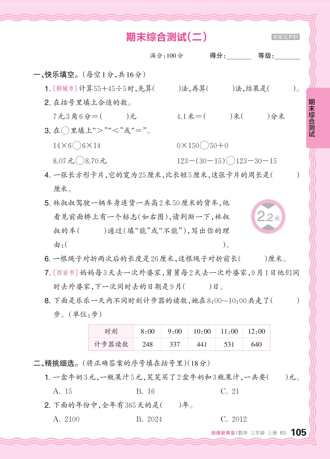 2024秋上册三年级数学北师版 期末综合测试(二)