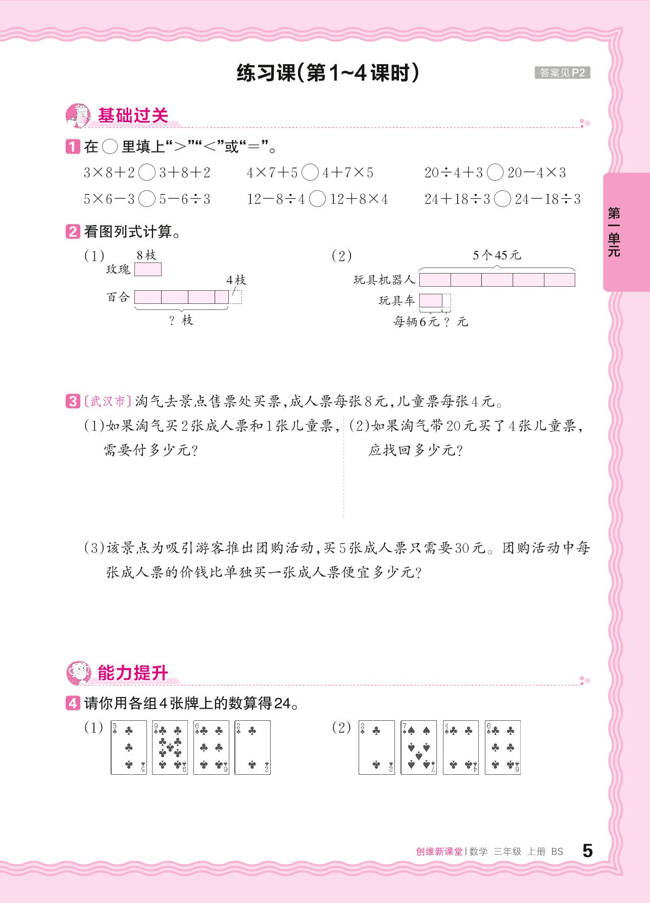 2024秋上册三年级数学北师版 第一单元 混合运算——小熊购物、买文具练习课