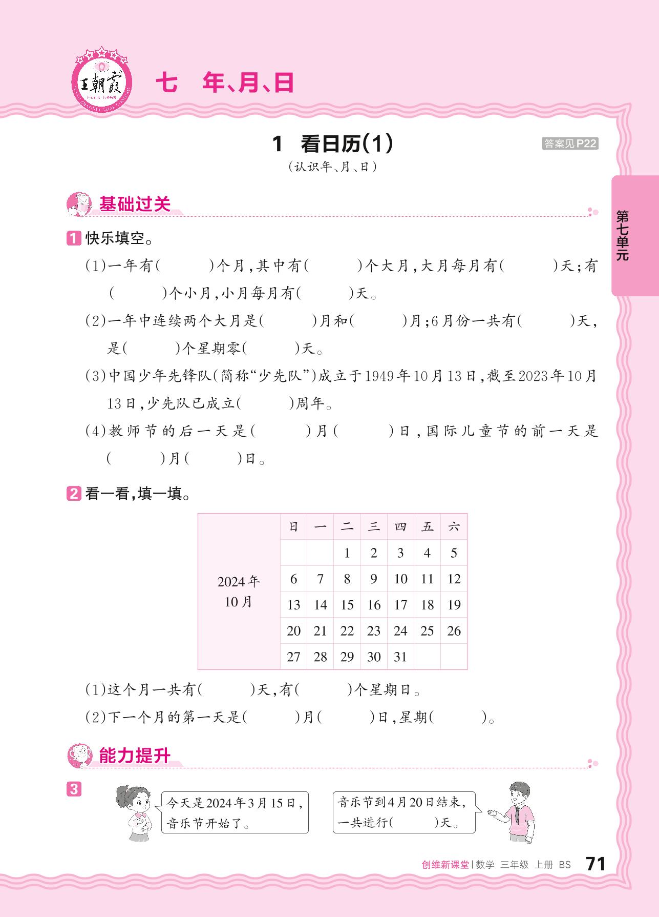 2024秋上册三年级数学北师版 第七单元 年、月、日——1. 看日历(1)