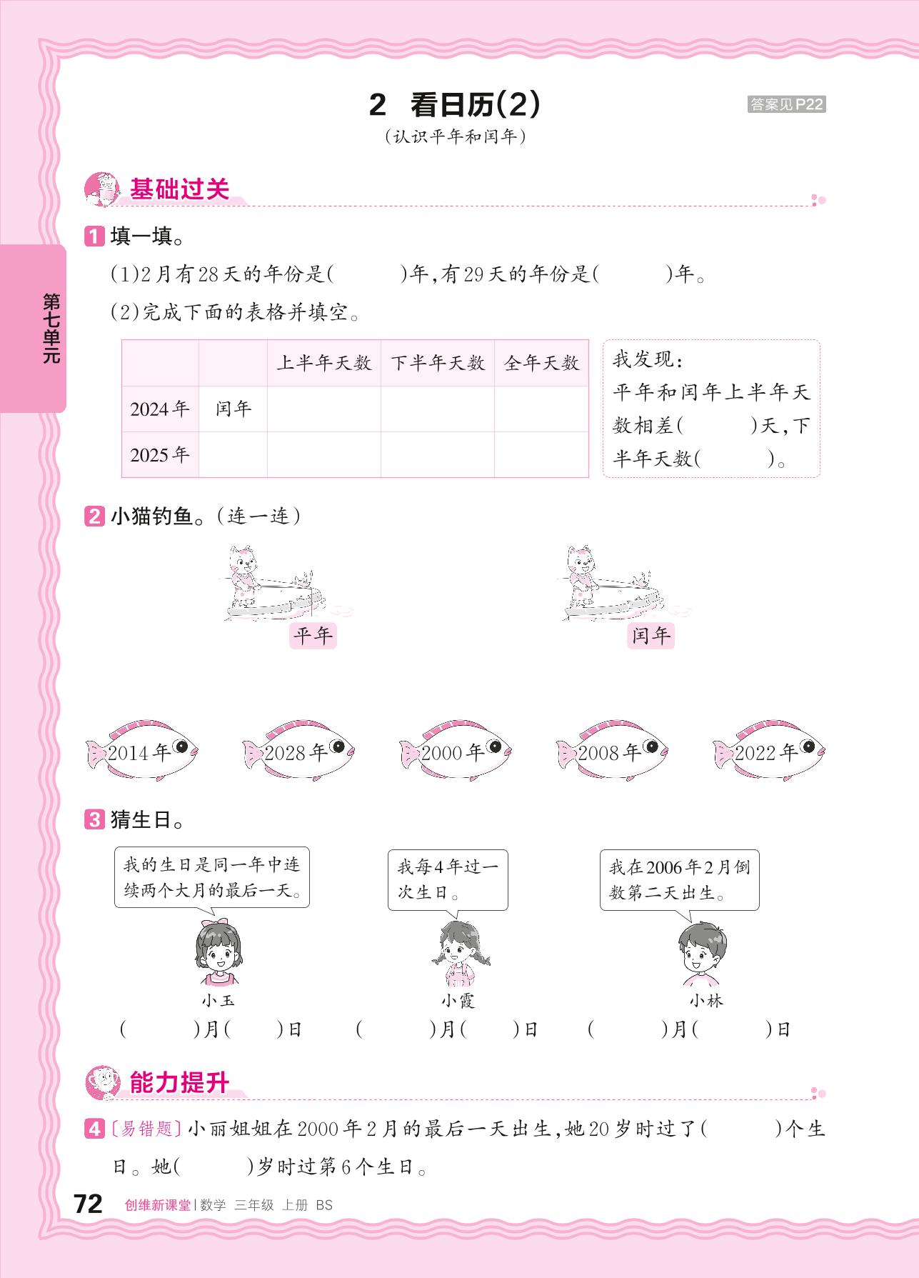 2024秋上册三年级数学北师版 第七单元 年、月、日——2. 看日历(2)