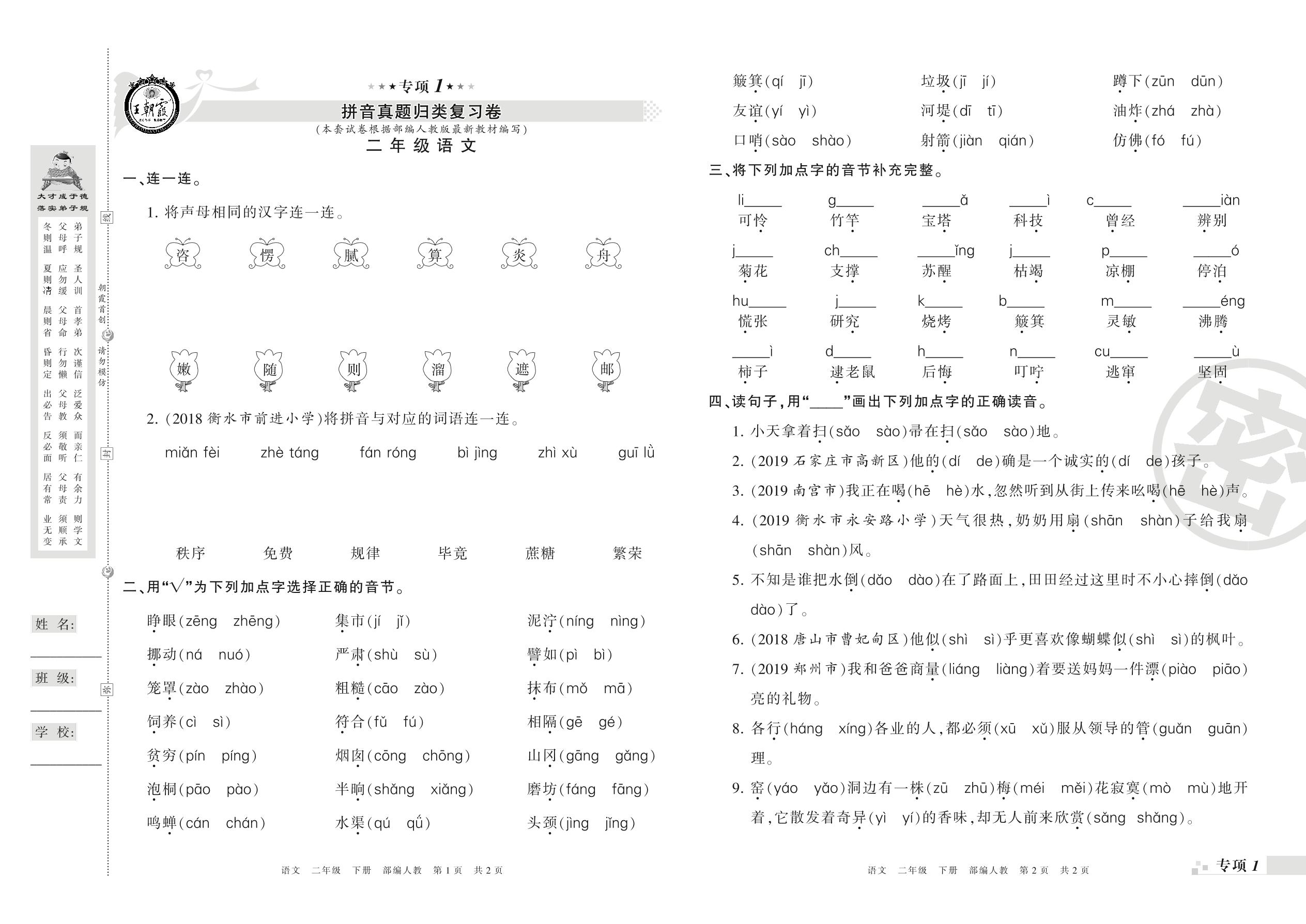 王朝霞期末专项卷——拼音、汉字真题归类复习卷二年级下册语文(人教版)_R21080170401【0】
