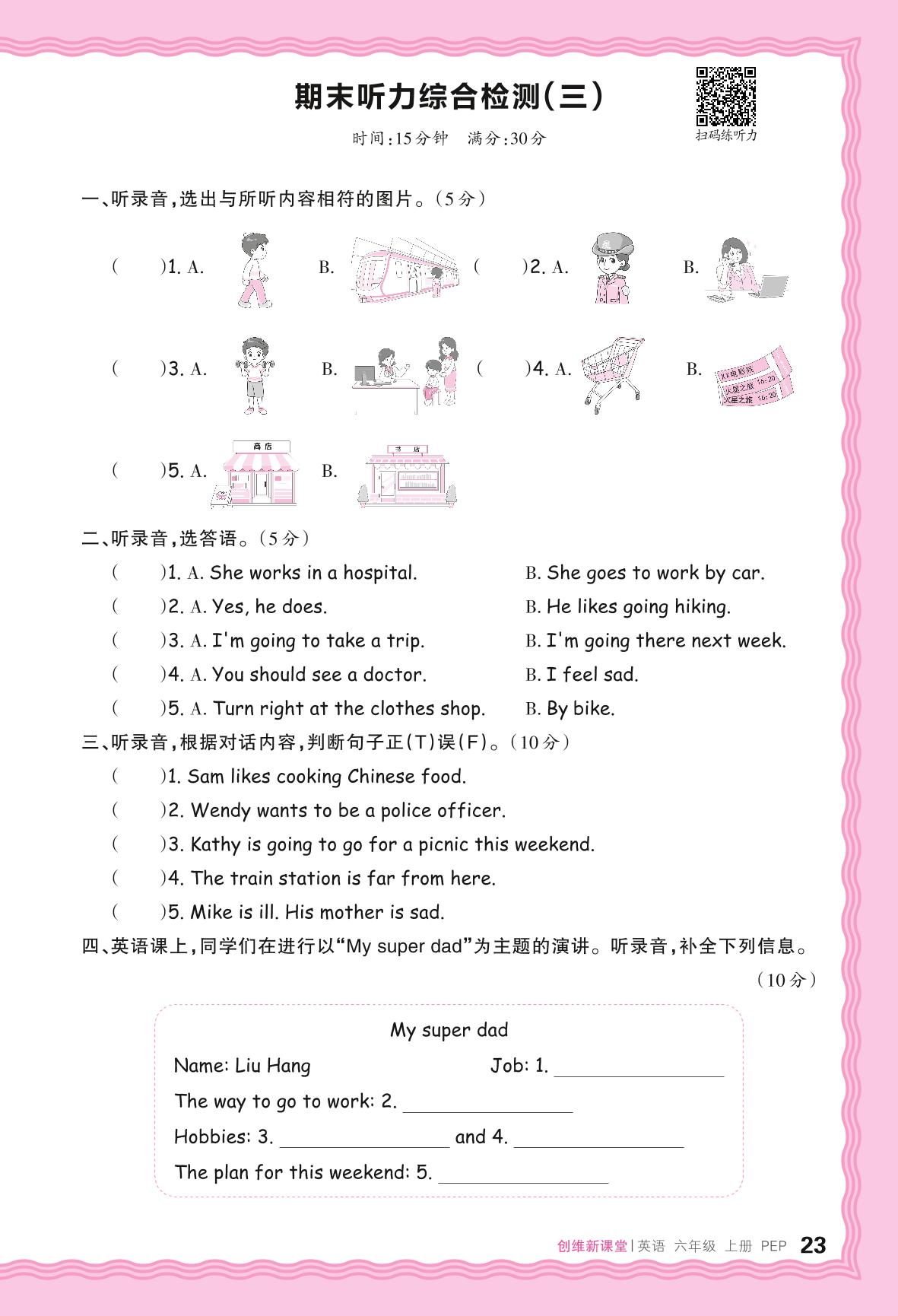 2024秋上册六年级英语人教PEP版(三起始) 期末听力综合检测(三)