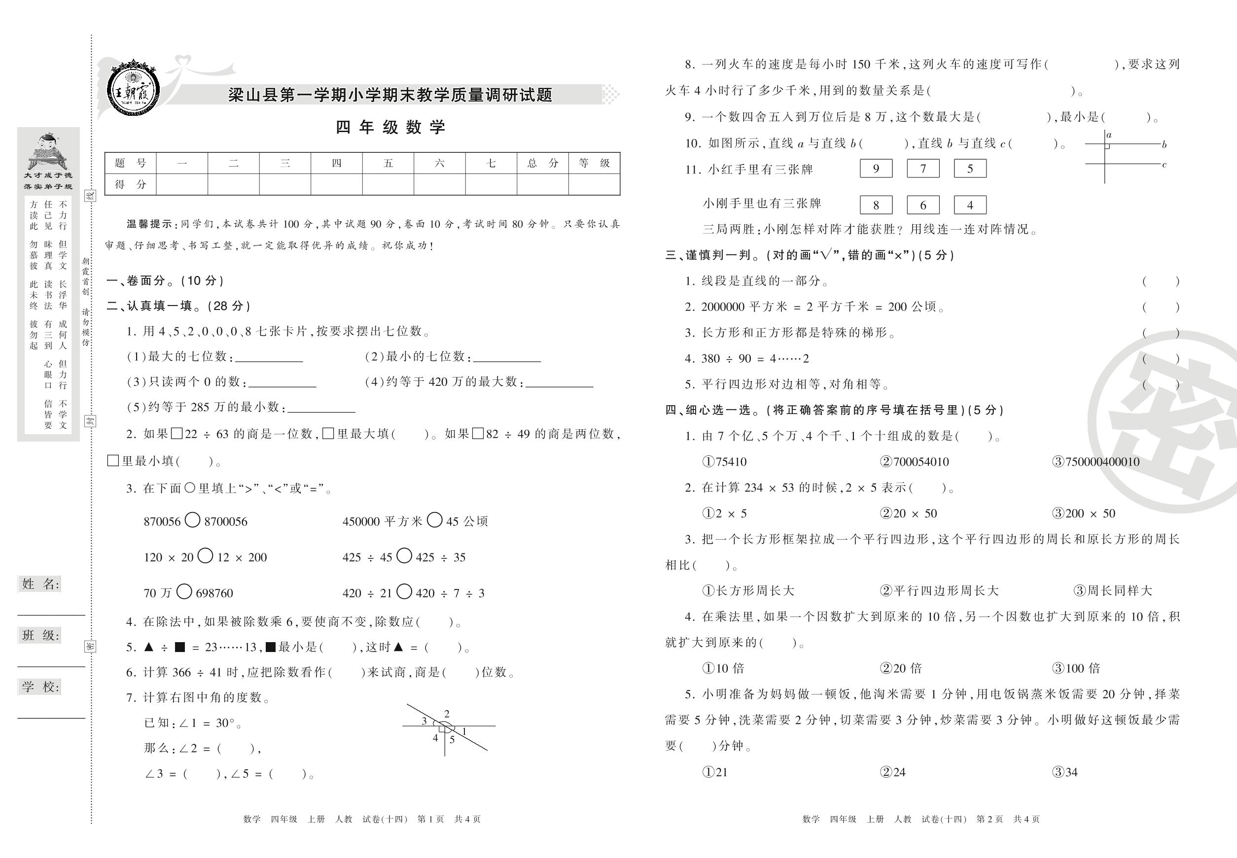 2016-2017学年第一学期济宁市梁山县四年级数学试卷(人教版)【14】