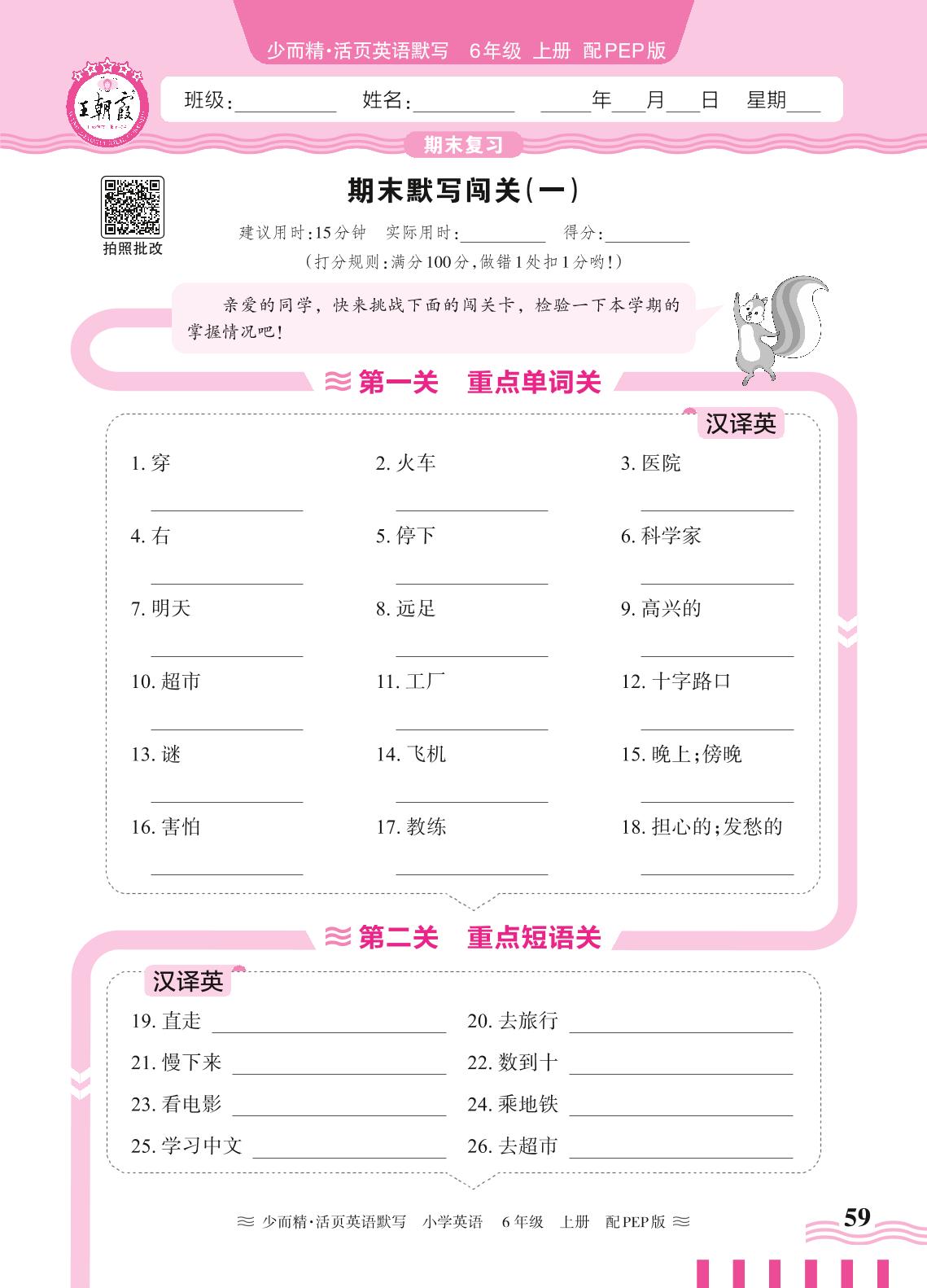 2024秋上册六年级英语人教PEP版(三起始) 期末默写闯关(一)