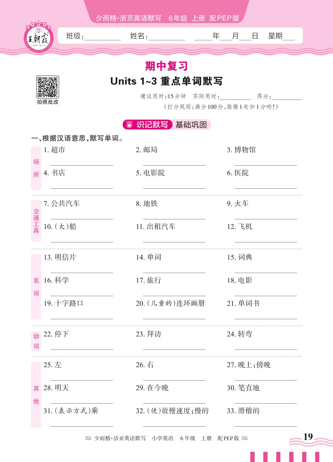 2024秋上册六年级英语人教PEP版(三起始) 期中复习—Units 1~3 重点单词默写