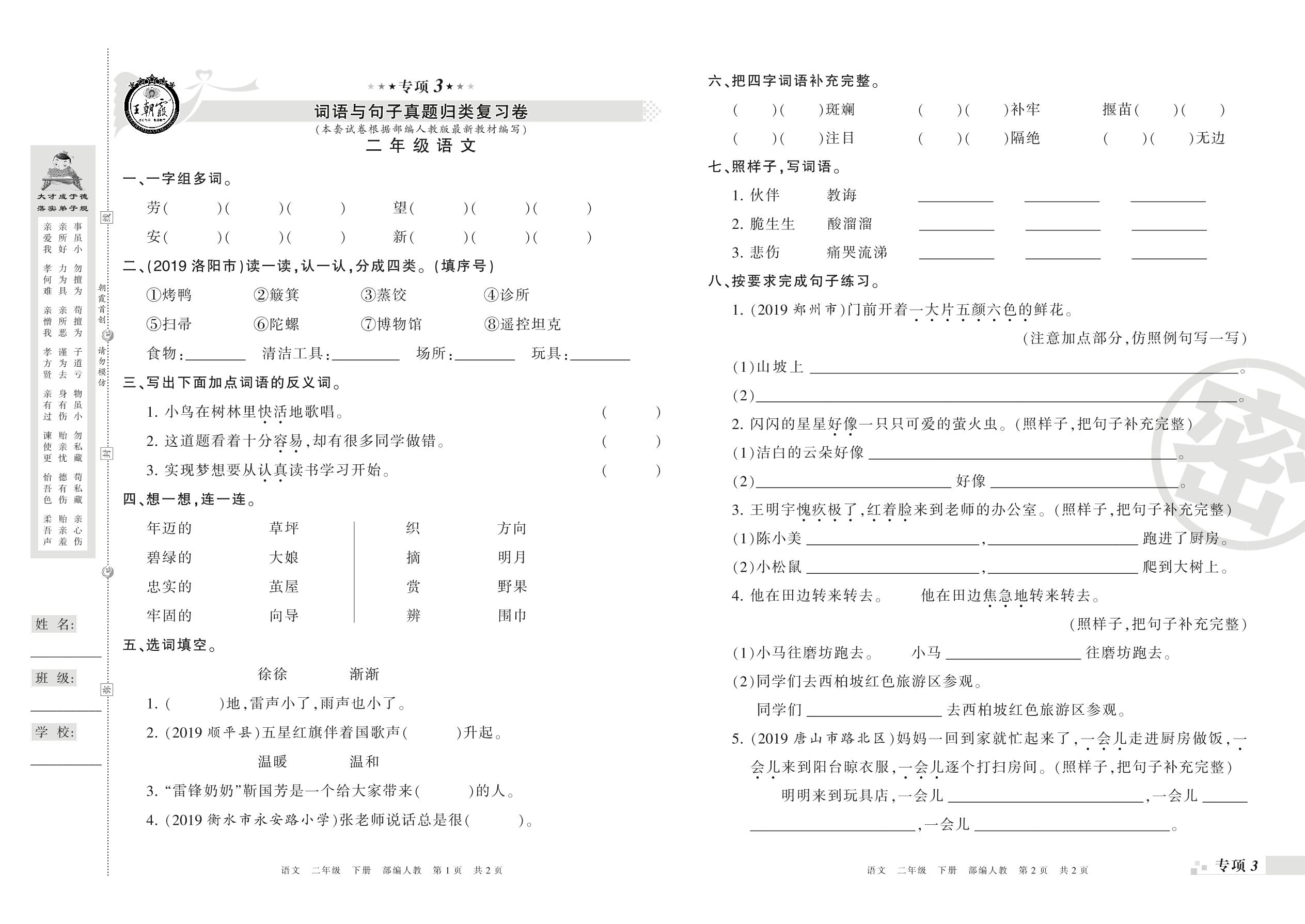 王朝霞期末专项卷——词语与句子、课文内容与积累运用真题归类复习卷二年级下册语文(人教版)_R21080170404【0】