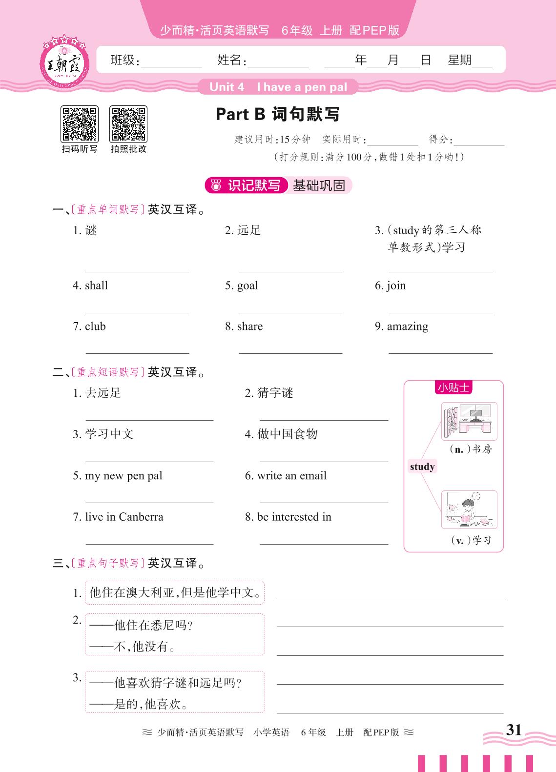 2024秋上册六年级英语人教PEP版(三起始) Unit 4—Part B 词句默写