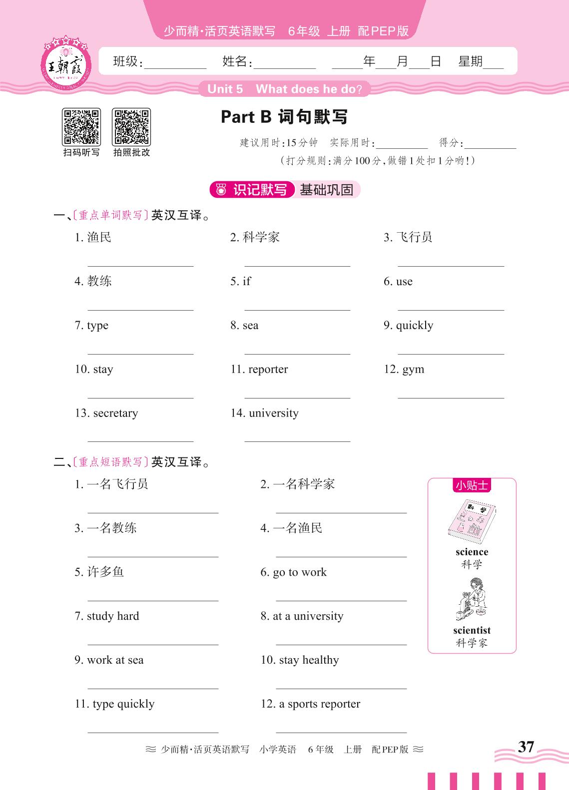 2024秋上册六年级英语人教PEP版(三起始) Unit 5—Part B 词句默写