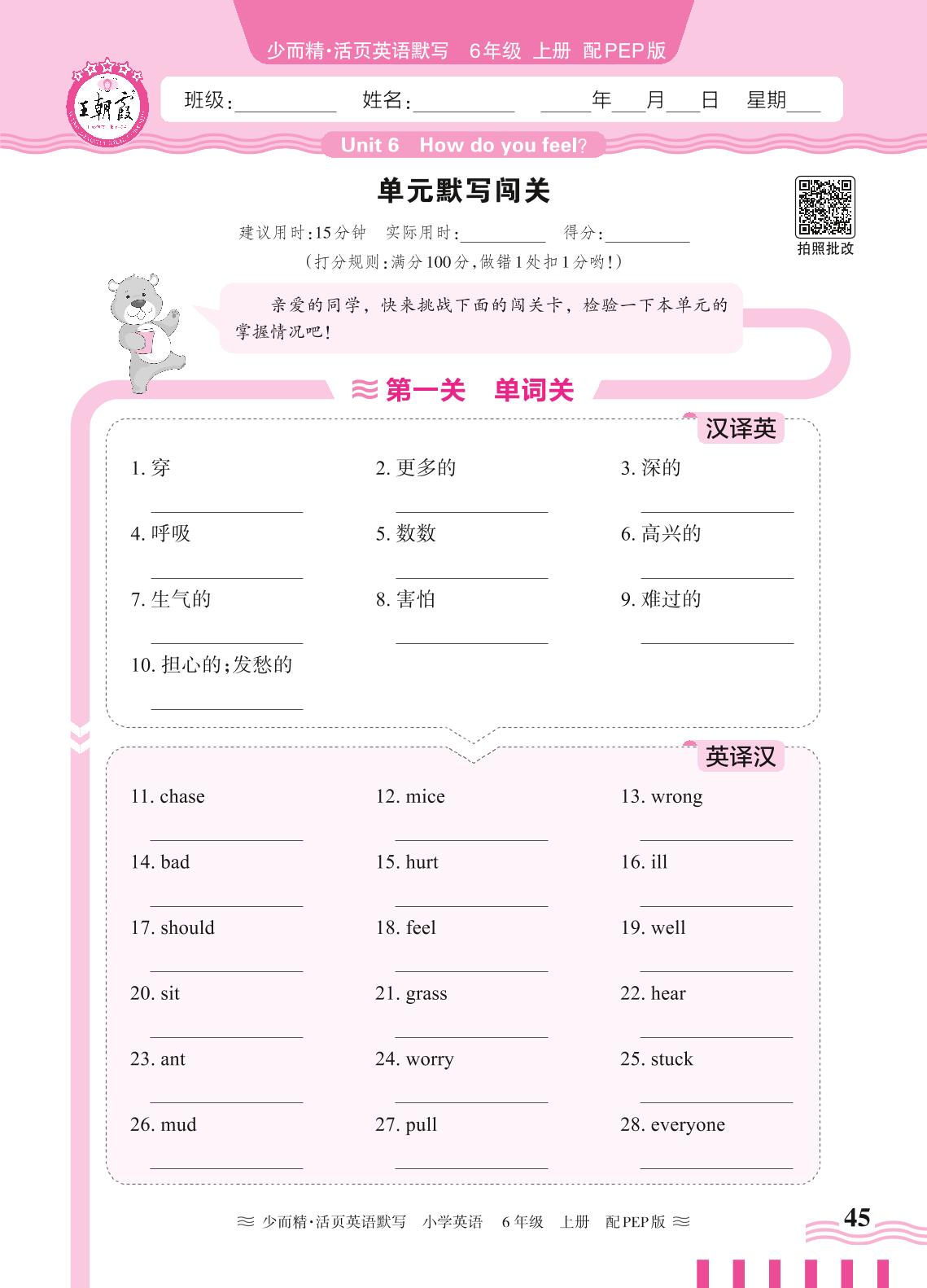 2024秋上册六年级英语人教PEP版(三起始) Unit 6 单元默写闯关