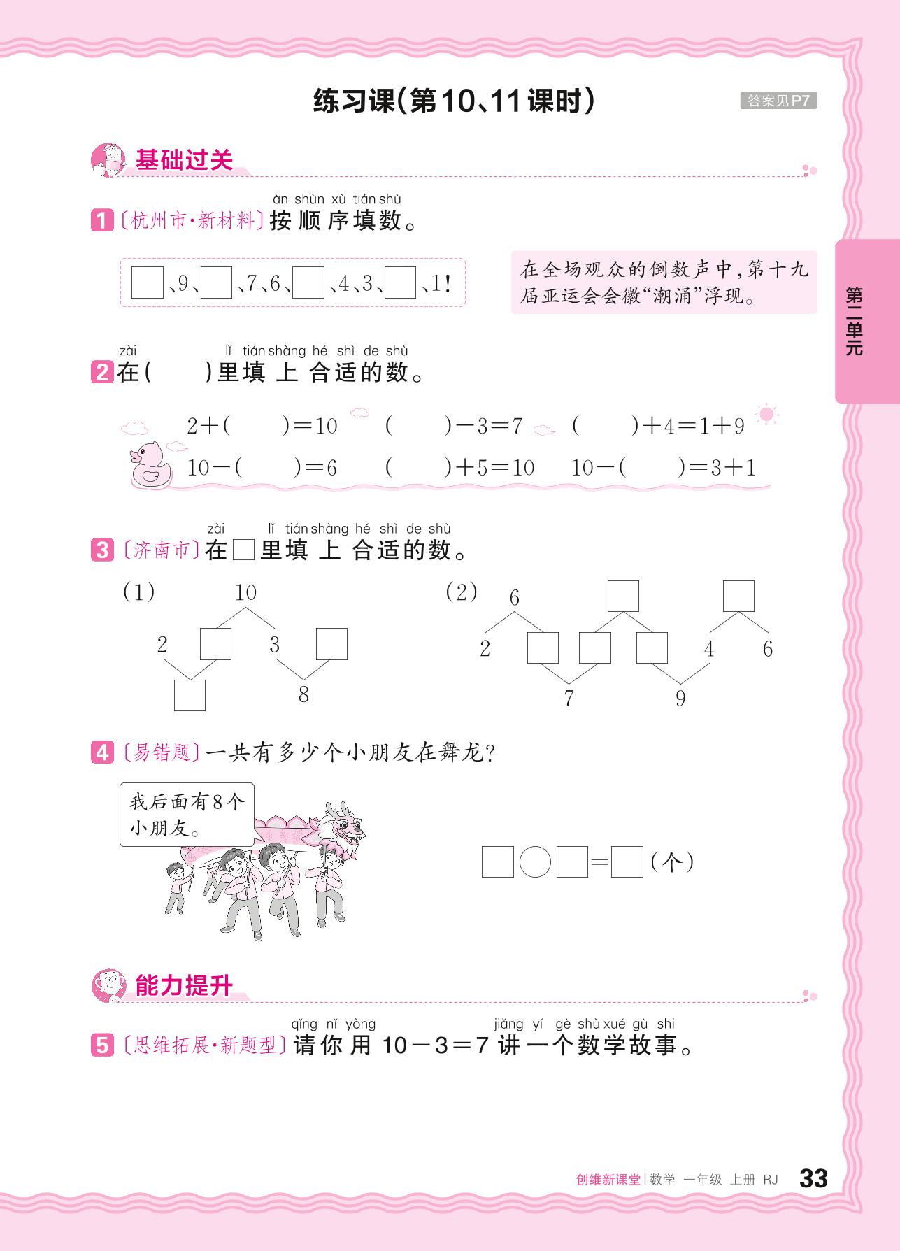 2024秋上册一年级数学人教版 第二单元 6~10的认识和加、减法——10的认识和加、减法练习课