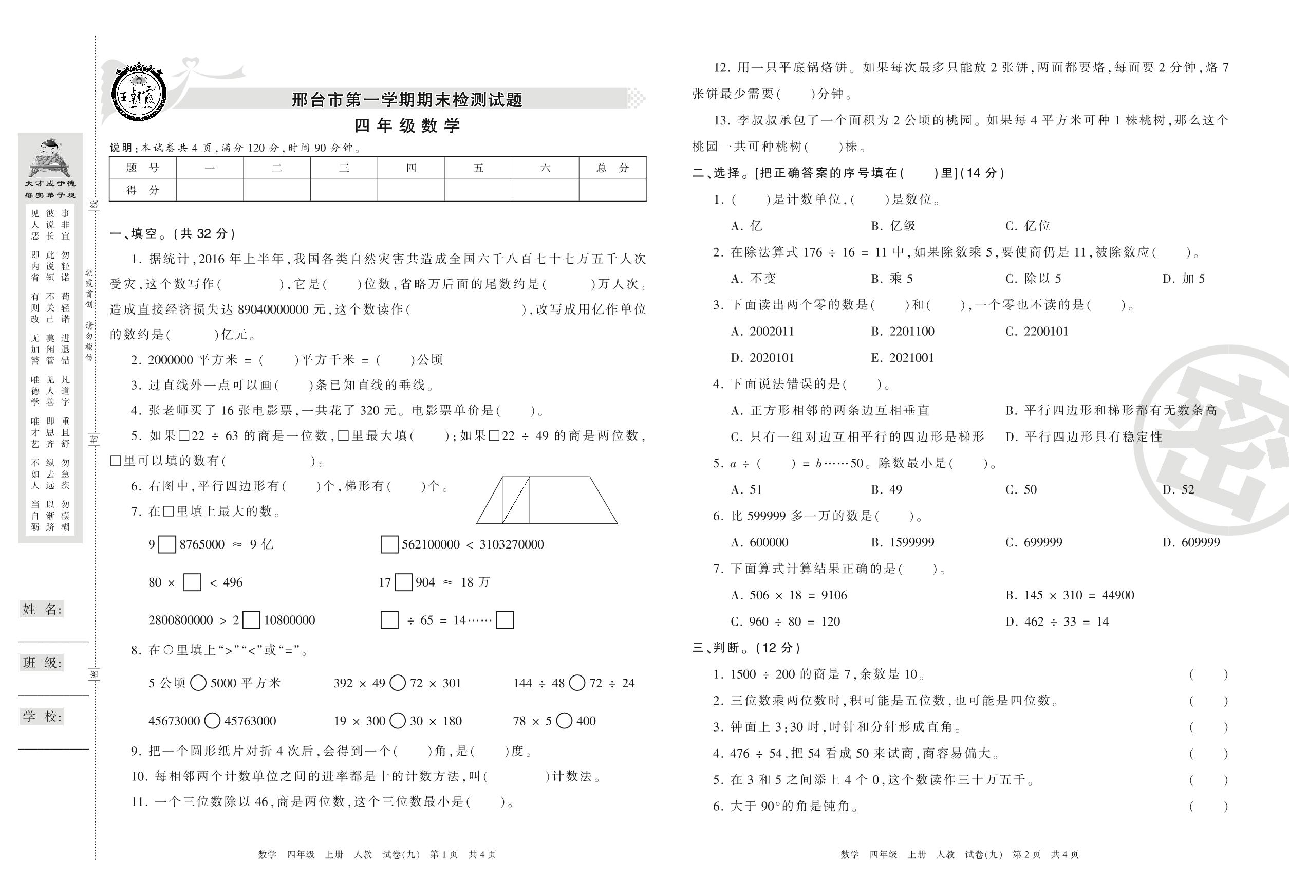 2016-2017学年第一学期邢台市四年级数学试卷(人教版)【9】