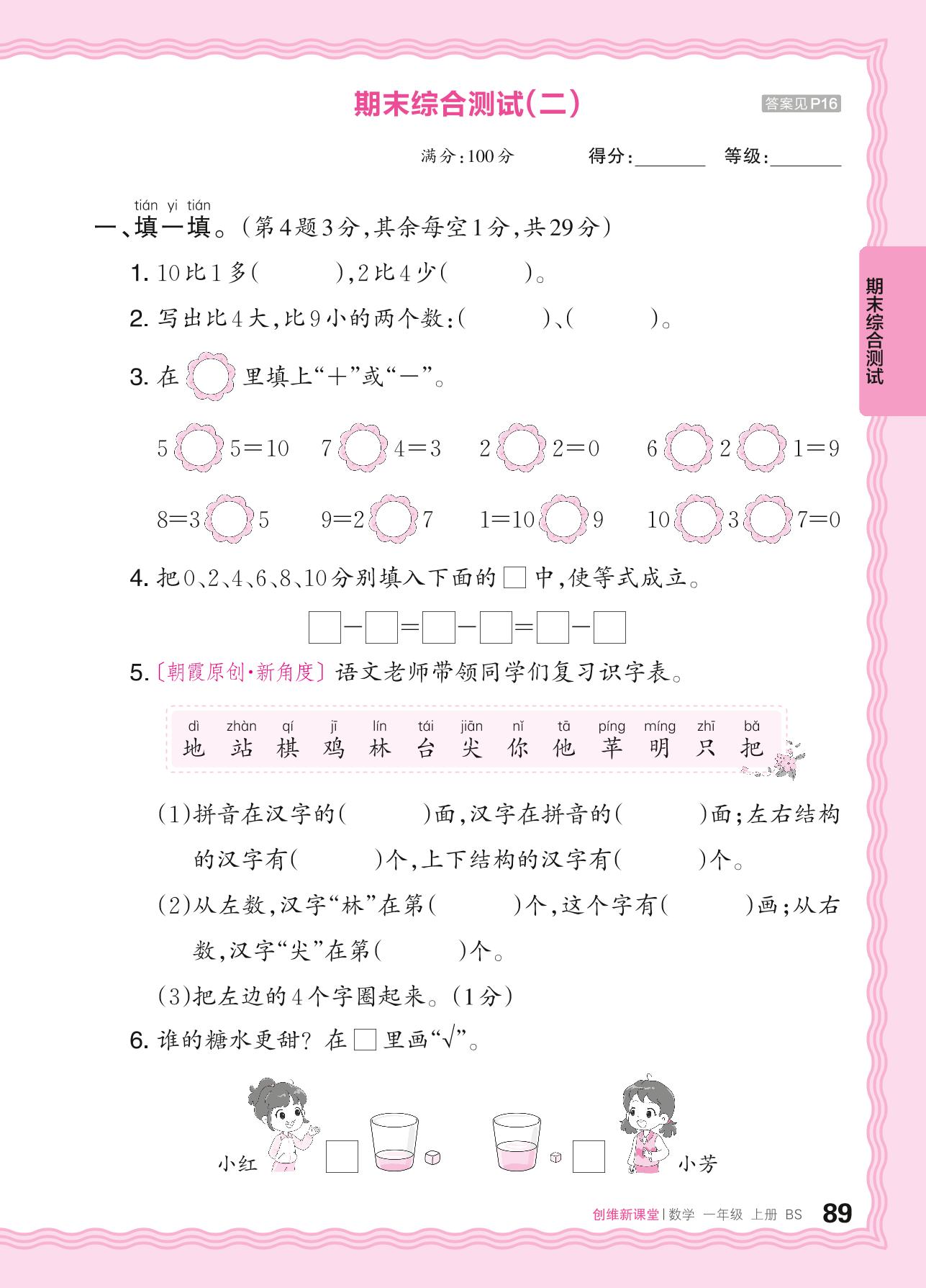 2024秋上册一年级数学北师版 期末综合测试(二)