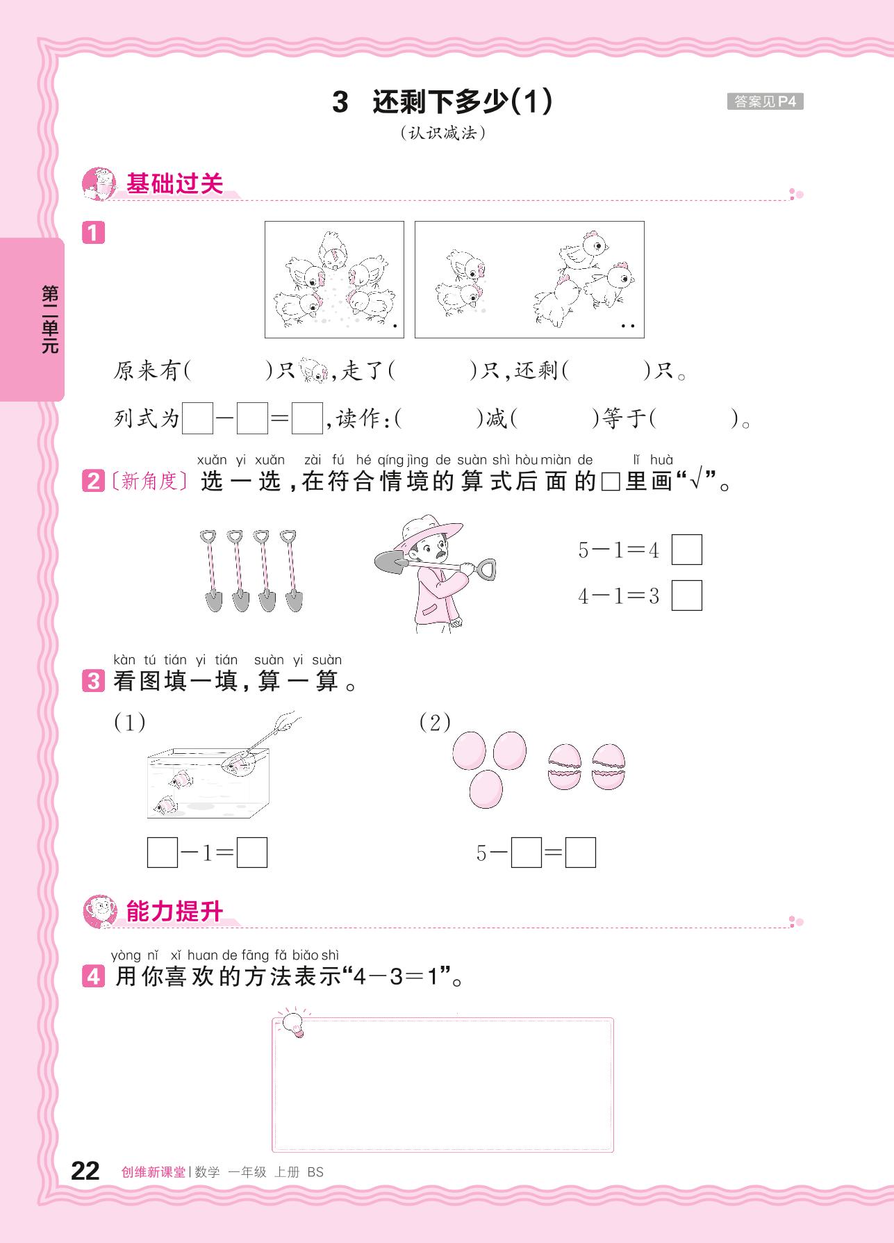 2024秋上册一年级数学北师版 第二单元 5以内数加与减——3. 还剩下多少(1)