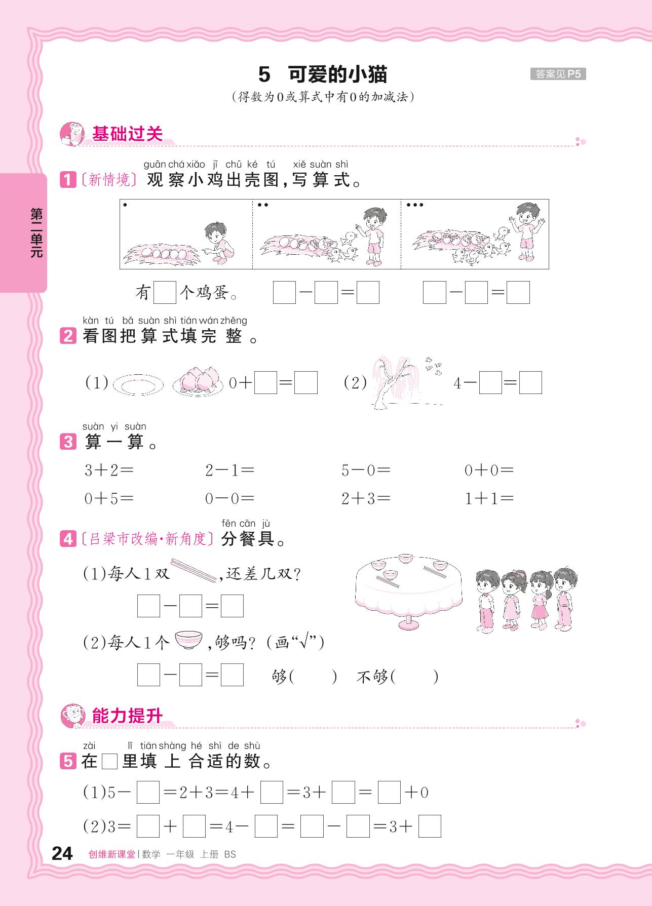 2024秋上册一年级数学北师版 第二单元 5以内数加与减——5. 可爱的小猫