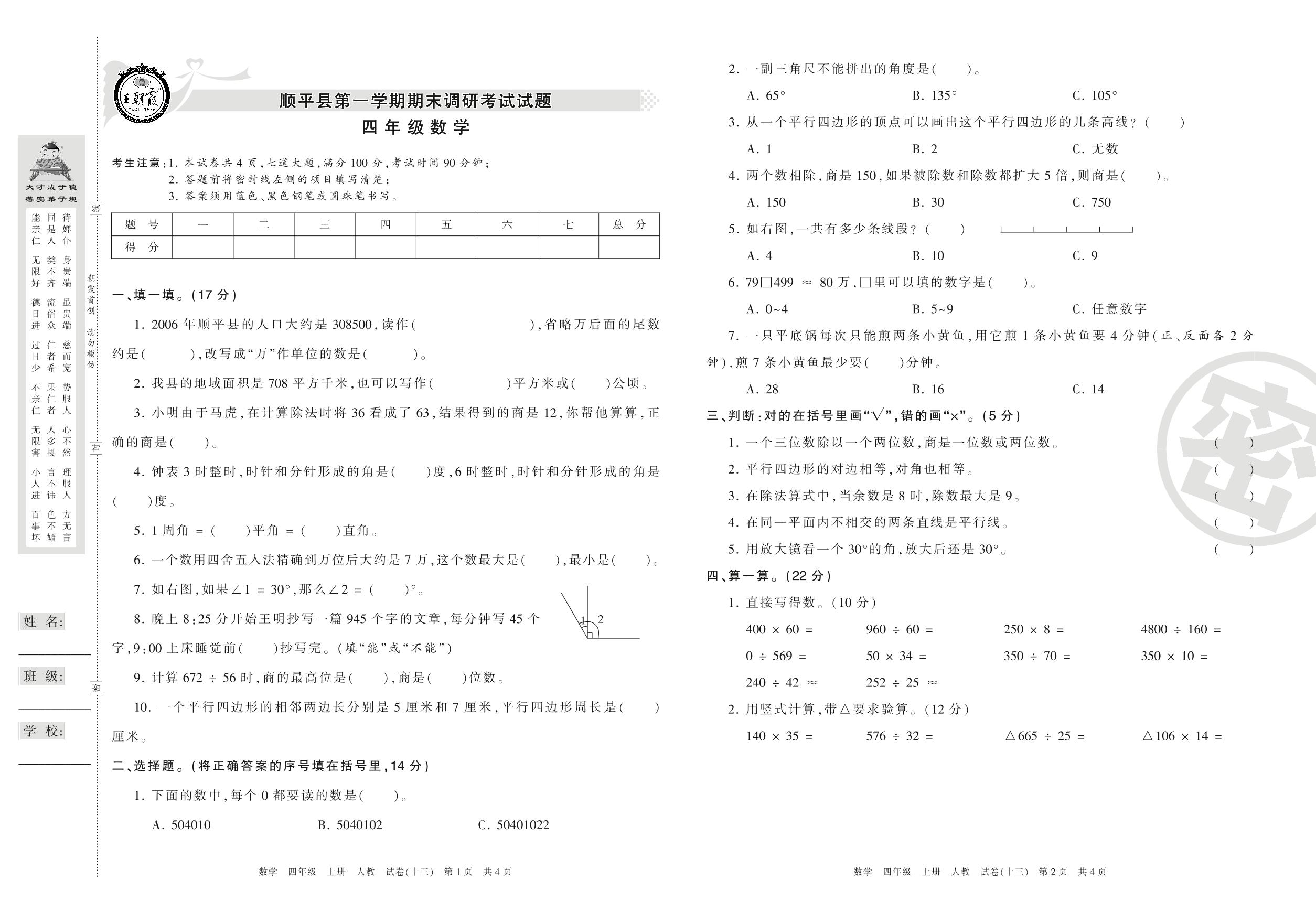 2016-2017学年第一学期保定市顺平县四年级数学试卷(人教版)【13】