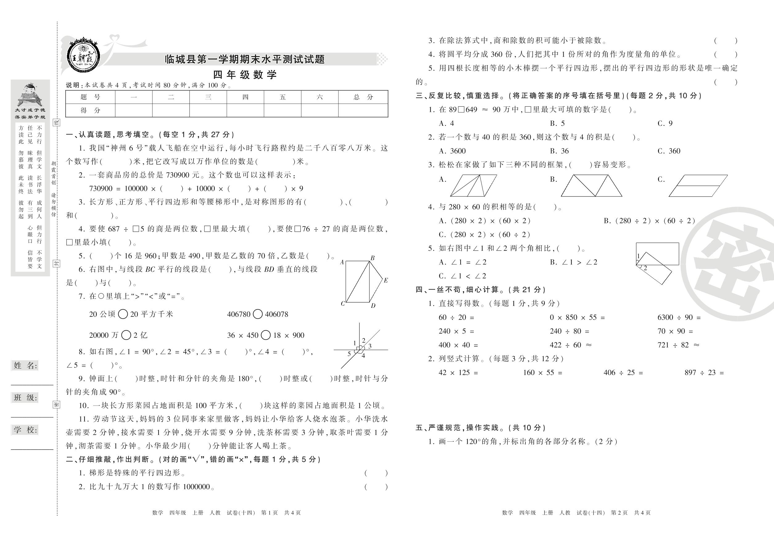 2016-2017学年第一学期邢台市临城县四年级数学试卷(人教版)【14】