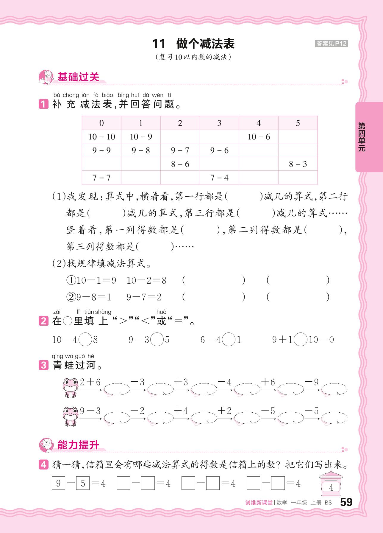 2024秋上册一年级数学北师版 第四单元 10以内数加与减——11. 做个减法表