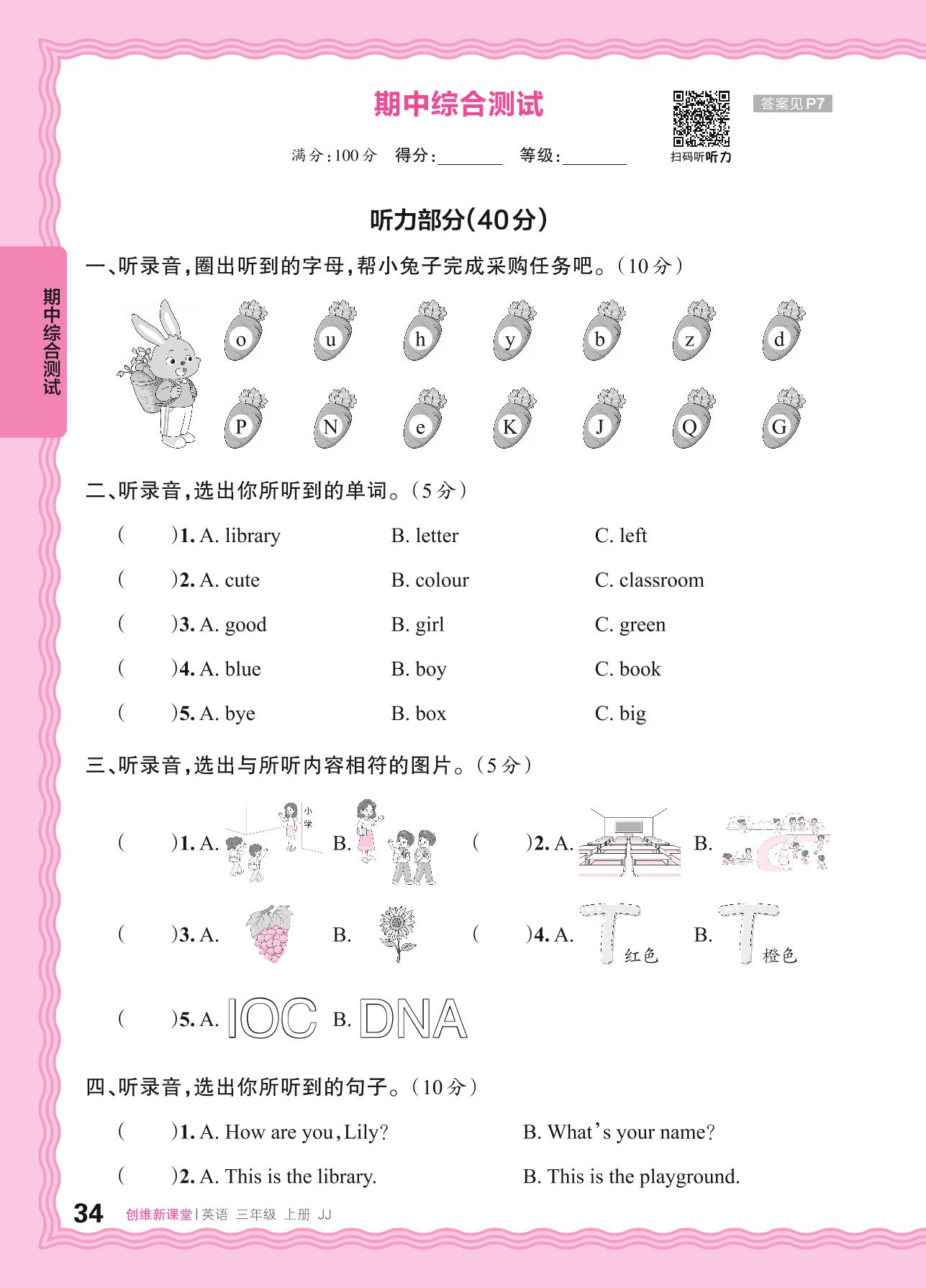 三年级英语冀教版(2024)上册期中卷