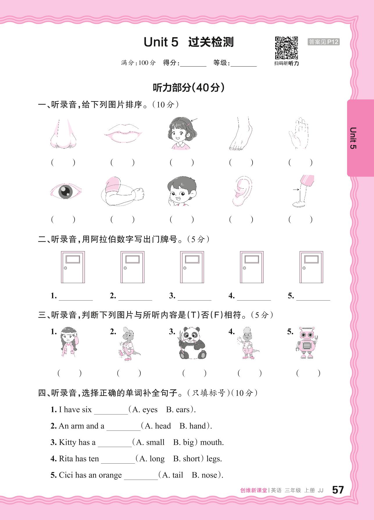 2024秋上册三年级英语冀教版 Unit 5 过关检测