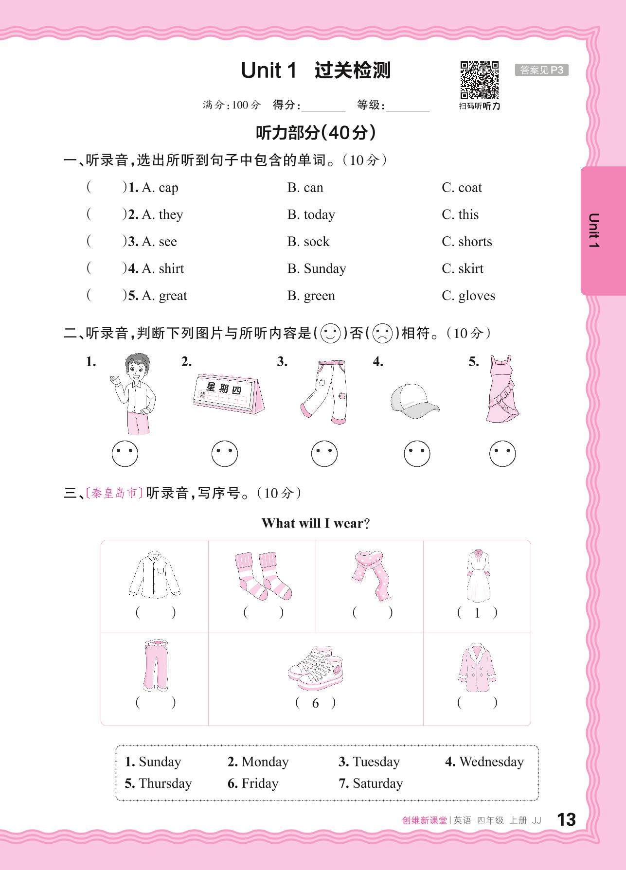 2024秋上册四年级英语冀教版 Unit 1 过关检测