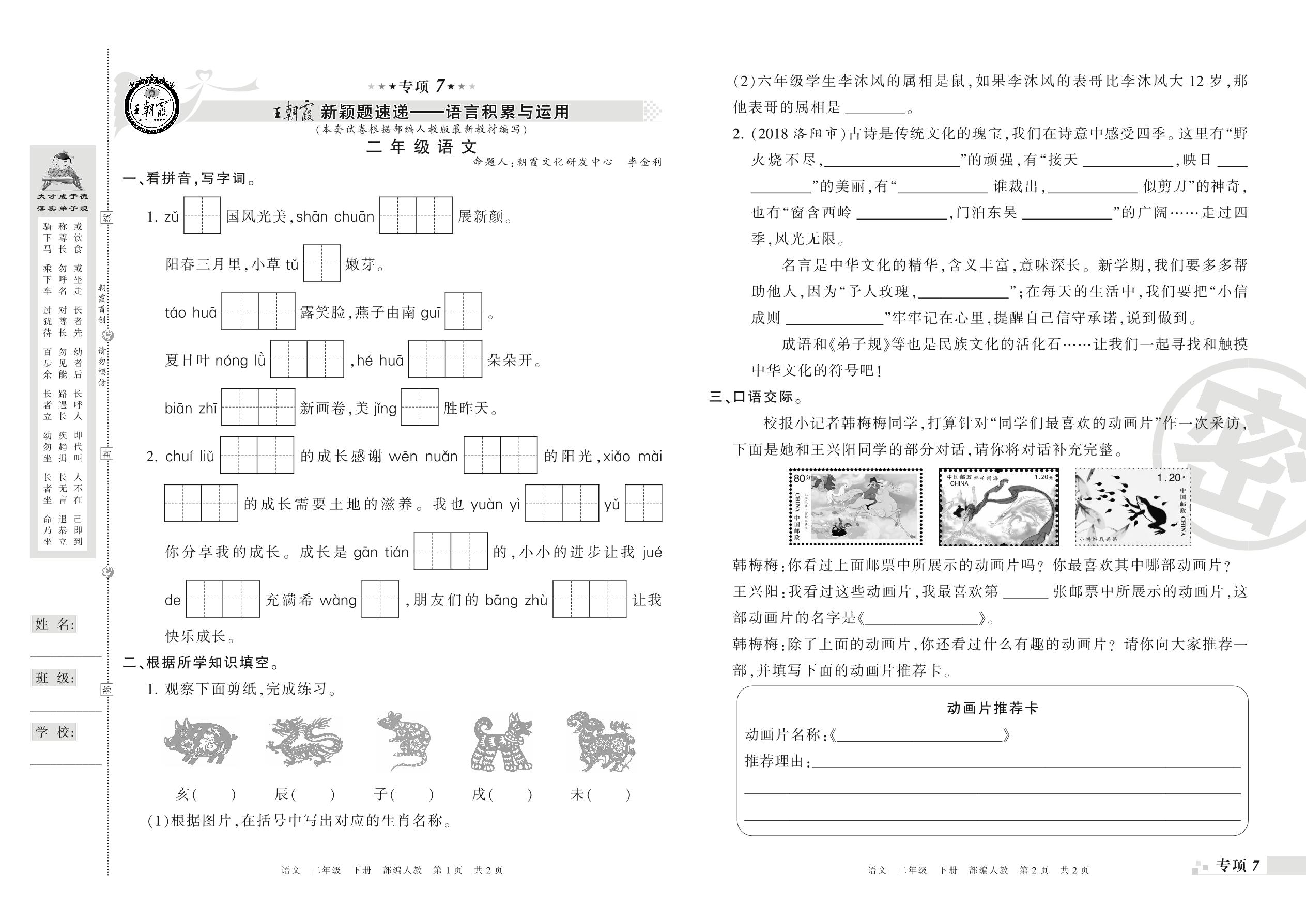 王朝霞期末专项卷——新颖题速递:语言积累与运用、非连续性文本阅读二年级下册语文(人教版)_R21080170411【0】