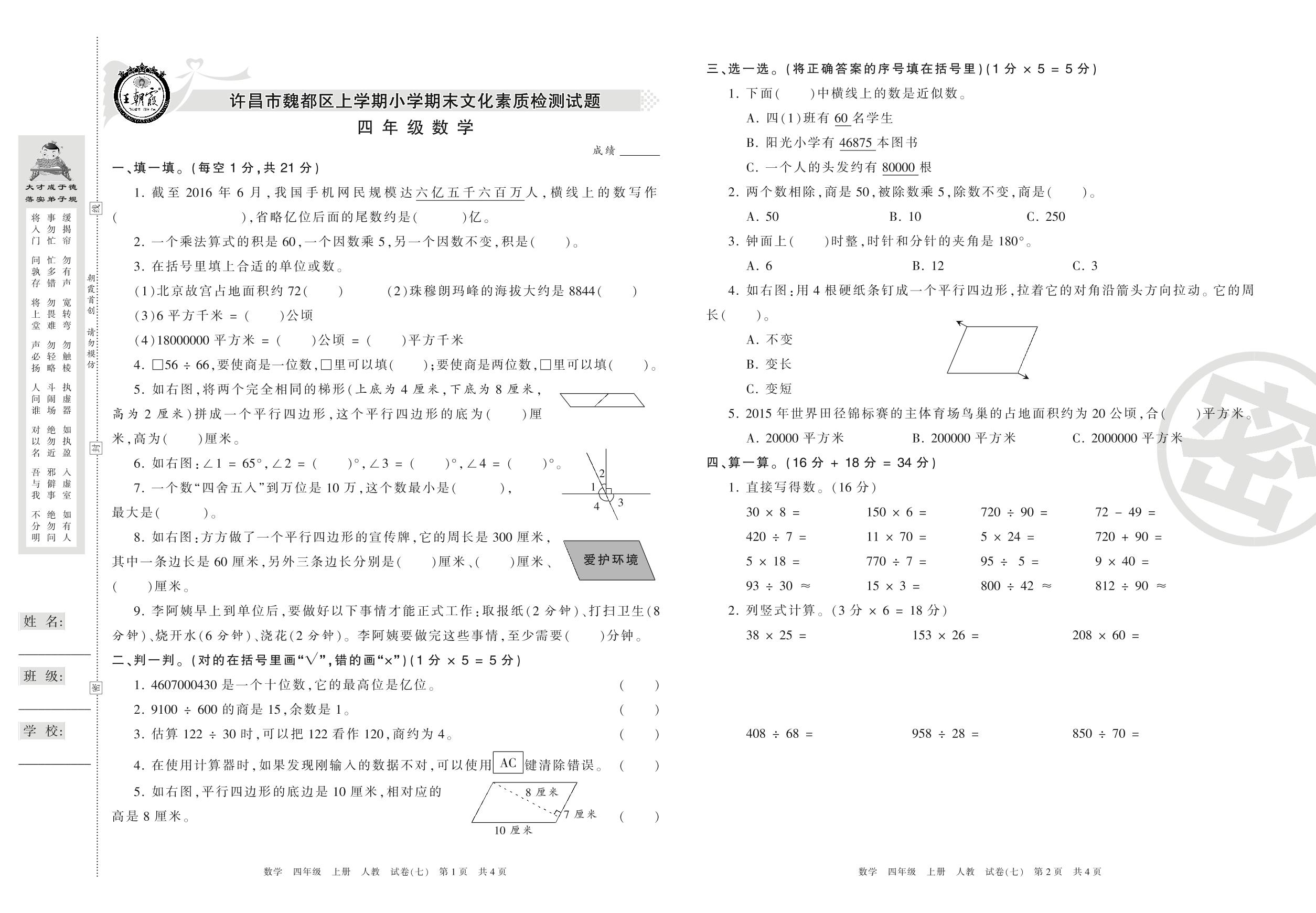2016-2017学年第一学期许昌市魏都区四年级数学试卷(人教版)【7】